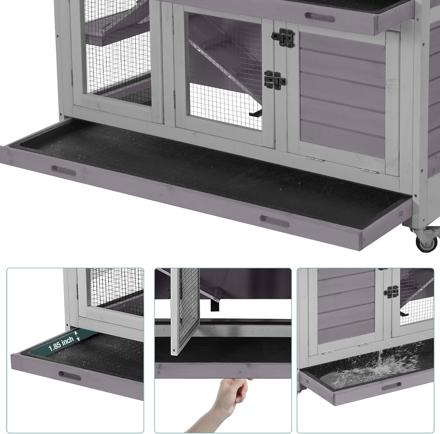 2-Tier Indoor Rabbit Hutch Bunny House Guinea Pig Cage with Sliding Plastic Trays, Wheels & Ramp, 47.2" Multi-Door Wooden Small Animal Cage for Rabbits, Bunnies, and Guinea Pigs (Grey)