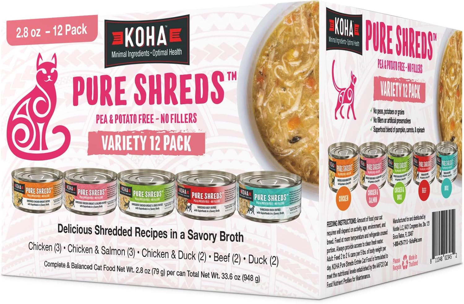 KOHA Pure Shreds Cat Variety Pack, High Protein Wet Cat Food - 5 Flavors - Beef, Duck, Chicken & Duck and Chicken & Salmon Food for Cats - 2.8 oz Cans, Pack of 12