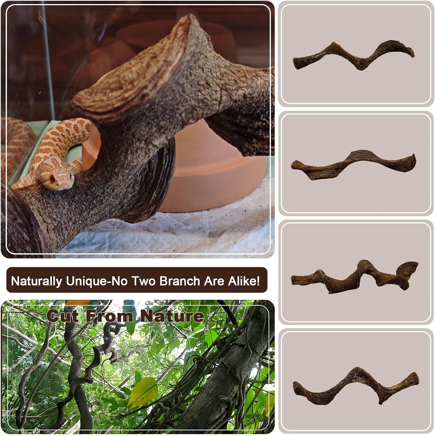 - 【Unique Branches】Our reptile branch decorations are carefully selected from naturally - grown vine branches in mountain jungles. These vines wind and twine around big trees as they grow, naturally bending into distinctive shapes. Each branch has a unique texture and shape, creating an exclusive natural habitat landscape for your pet.