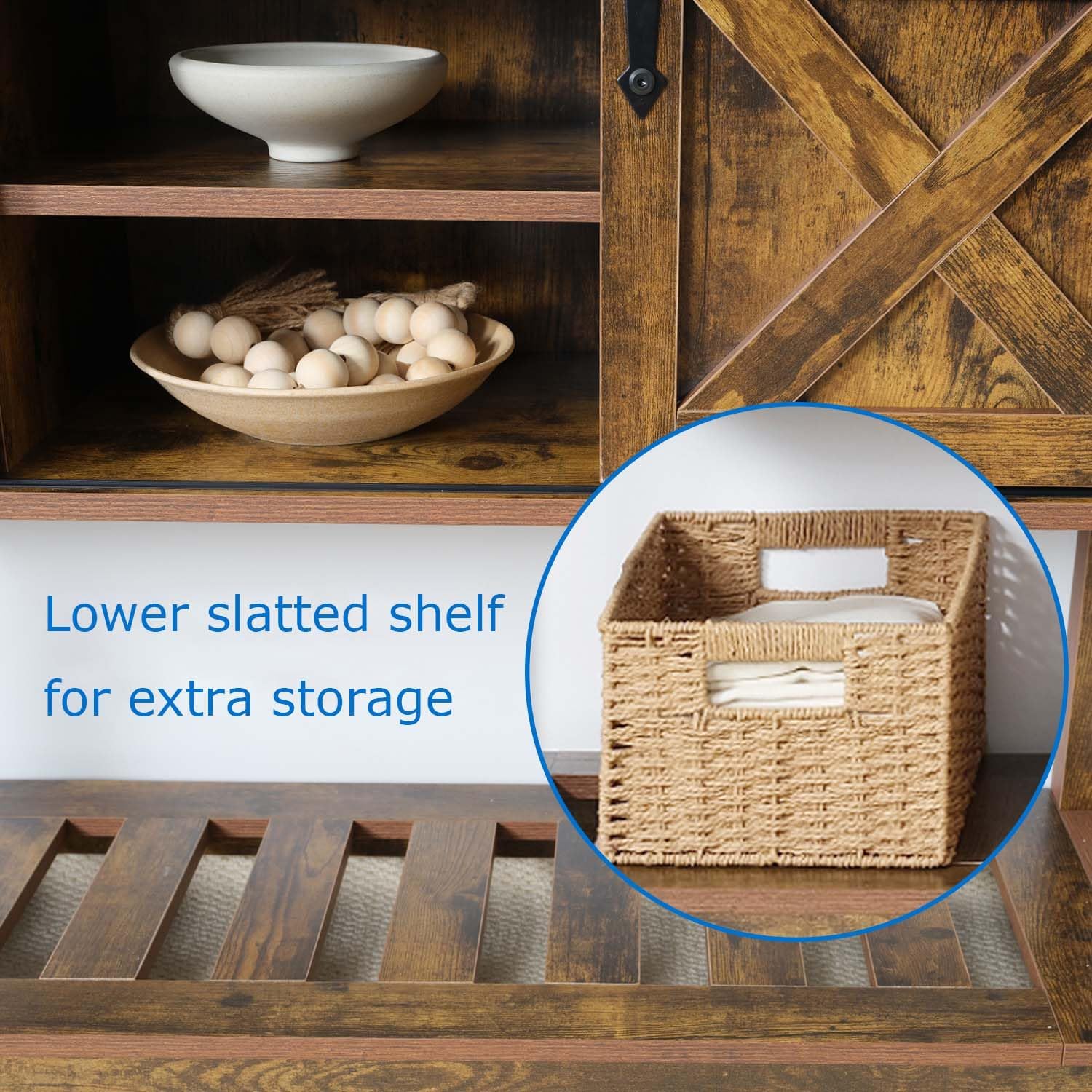 - Sliding Barn Doors & Ample Storage: Features rustic sliding barn doors with adjustable shelves, providing organized storage for kitchen essentials, making it an ideal buffet cabinet or coffee bar