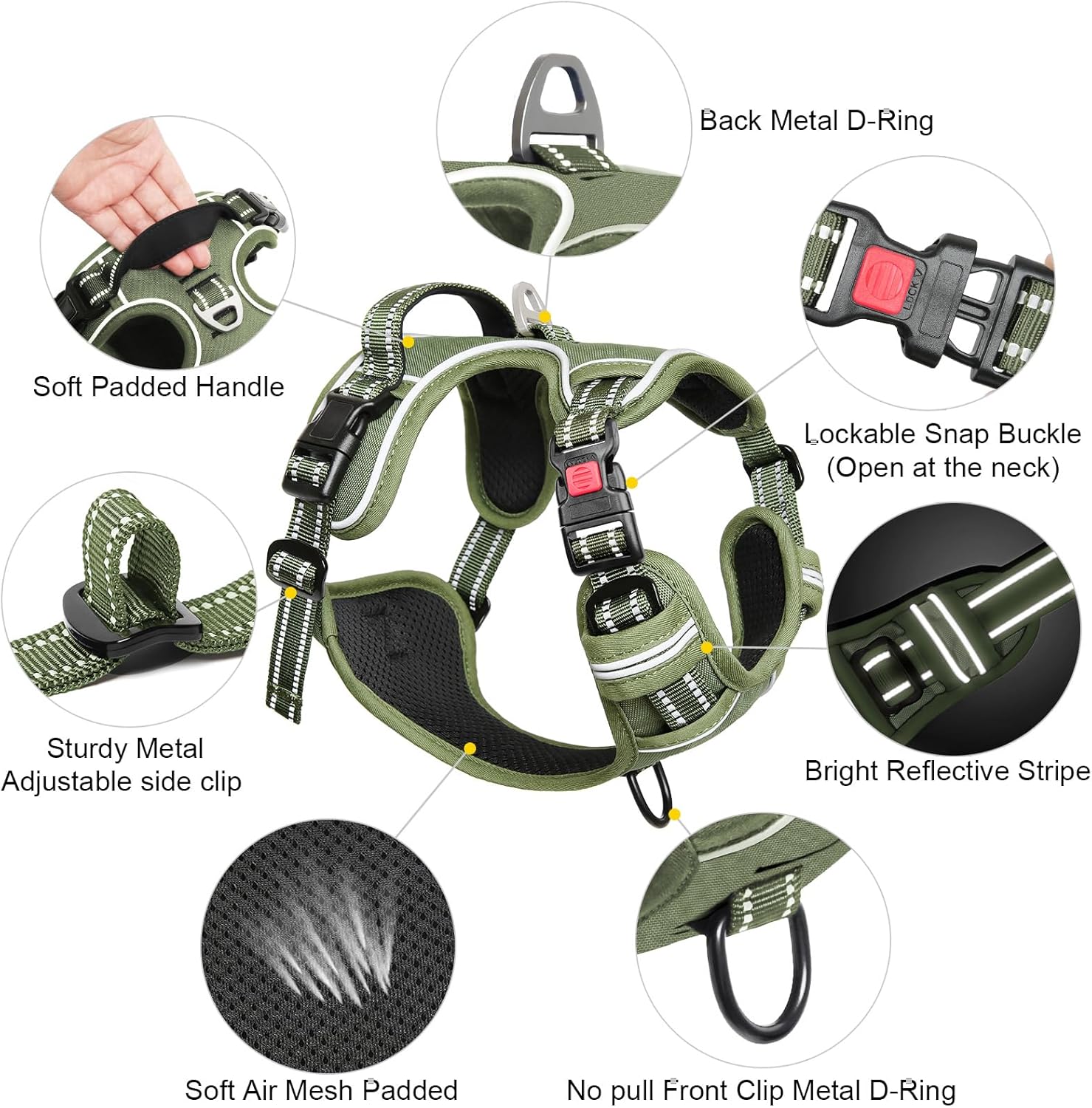 Timos Dog Harness Large Sized, No Pull Pet Harness with Neck Lockable Snap,No Choke Front Clip Dog Reflective Vest,Adjustable Metal Rings 3 Buckles,Easy Control Handle for Large Dogs Green XL