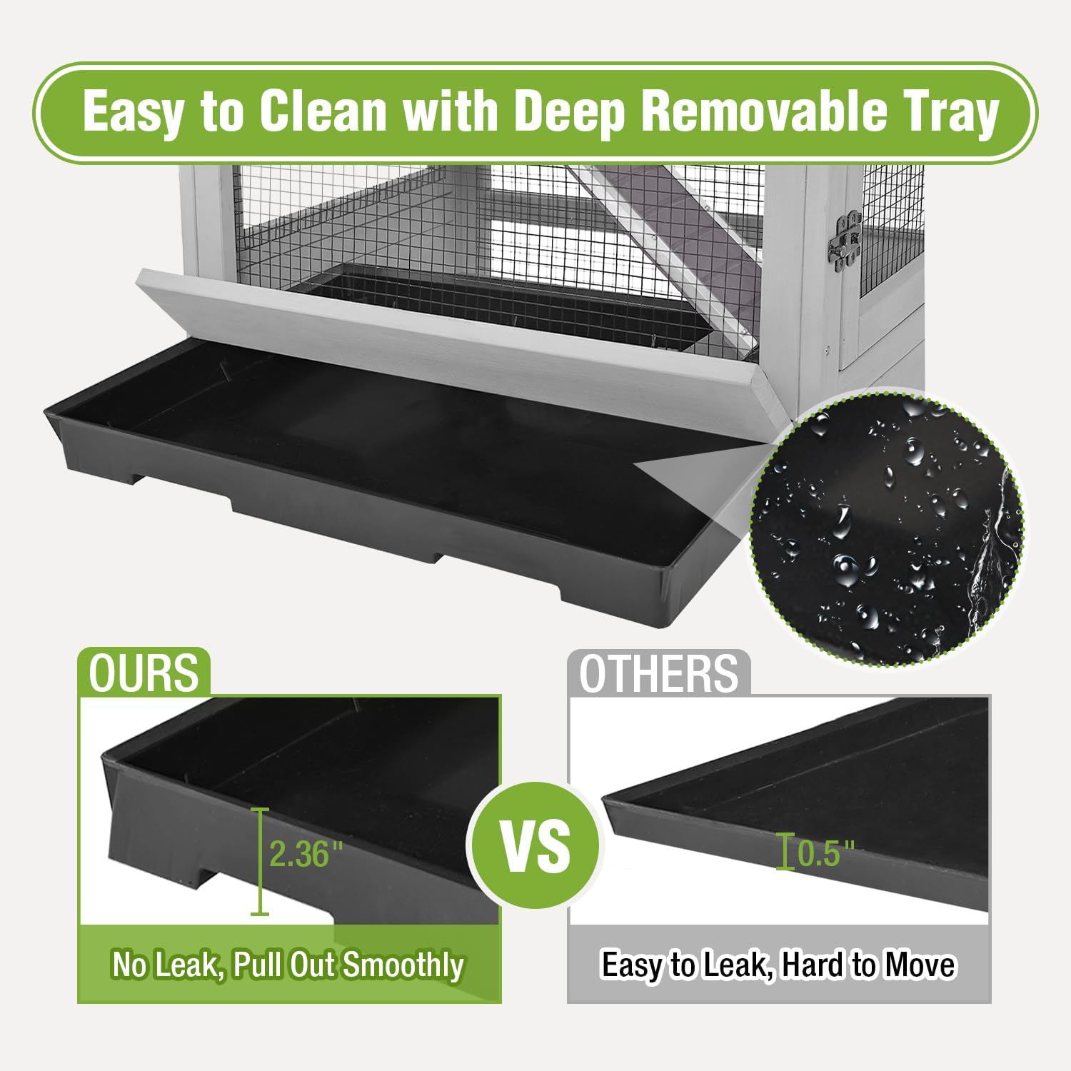 - ใLeaking Proofใ๐ชOur guinea pig cage is leaking proof; thickened wood design makes the bottom fit the tray more tightly to prevent urine leakage. 2.35" deeper tray provides ample room for bedding. Pull out freely from back and forth, easy to clean and give your pets a healthy life. Suitable for indoor and outdoor use.