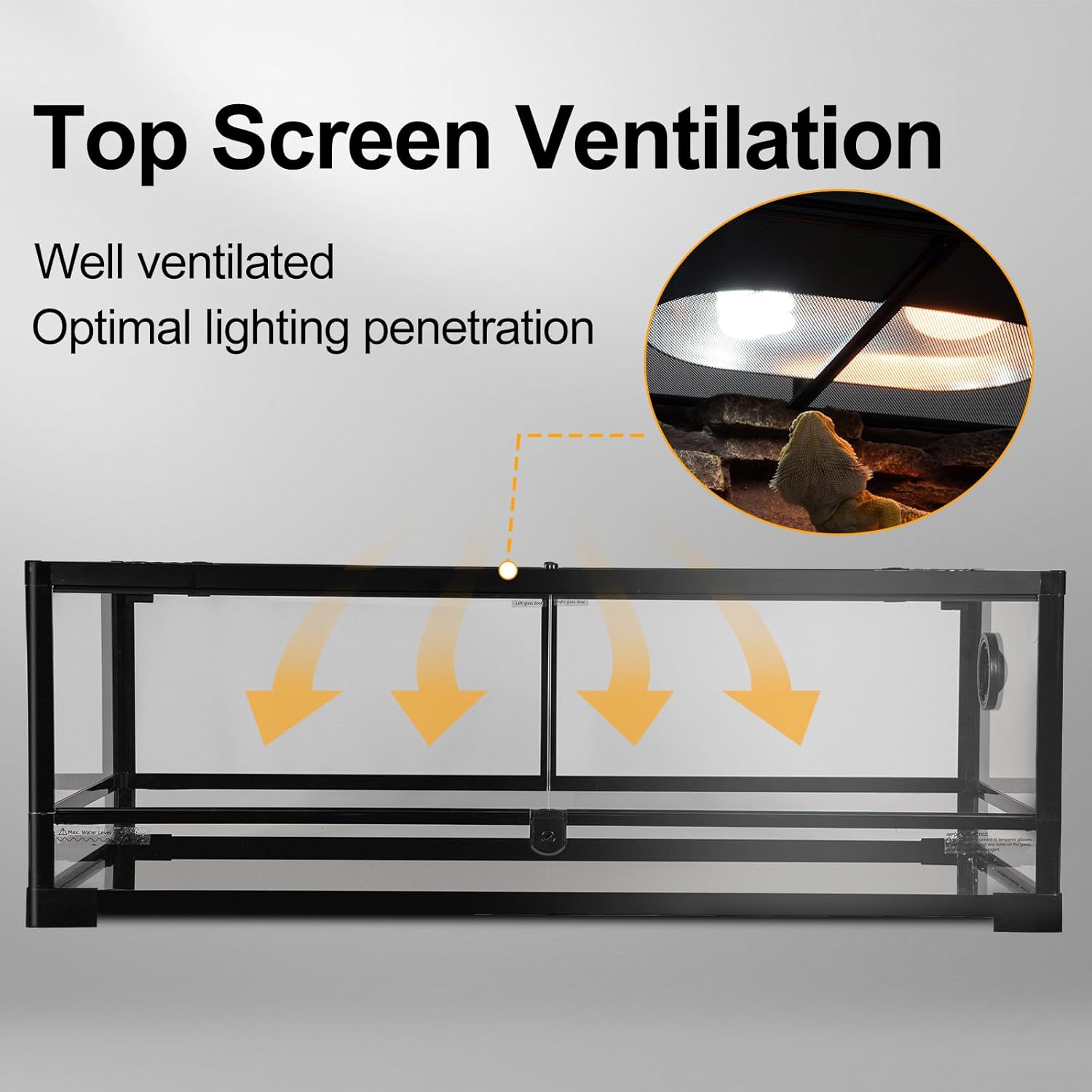 - Premium & Durable Construction: Featuring tempered glass on all four sides and aluminum alloy frame, iron mesh top, this terrarium delivers exceptional durability. Provides crystal-clear, uninterrupted viewing from every angle – an essential component for reptile habitat