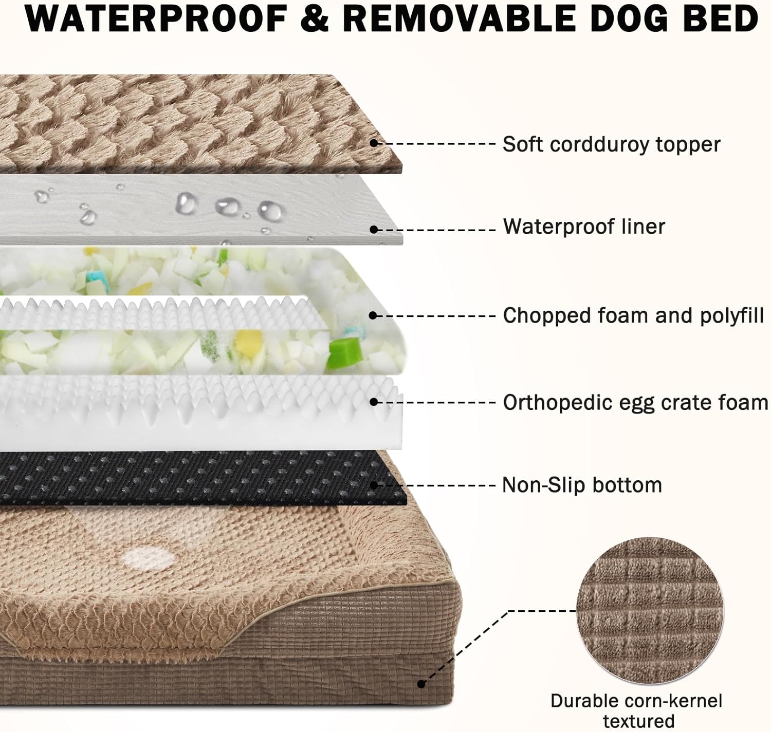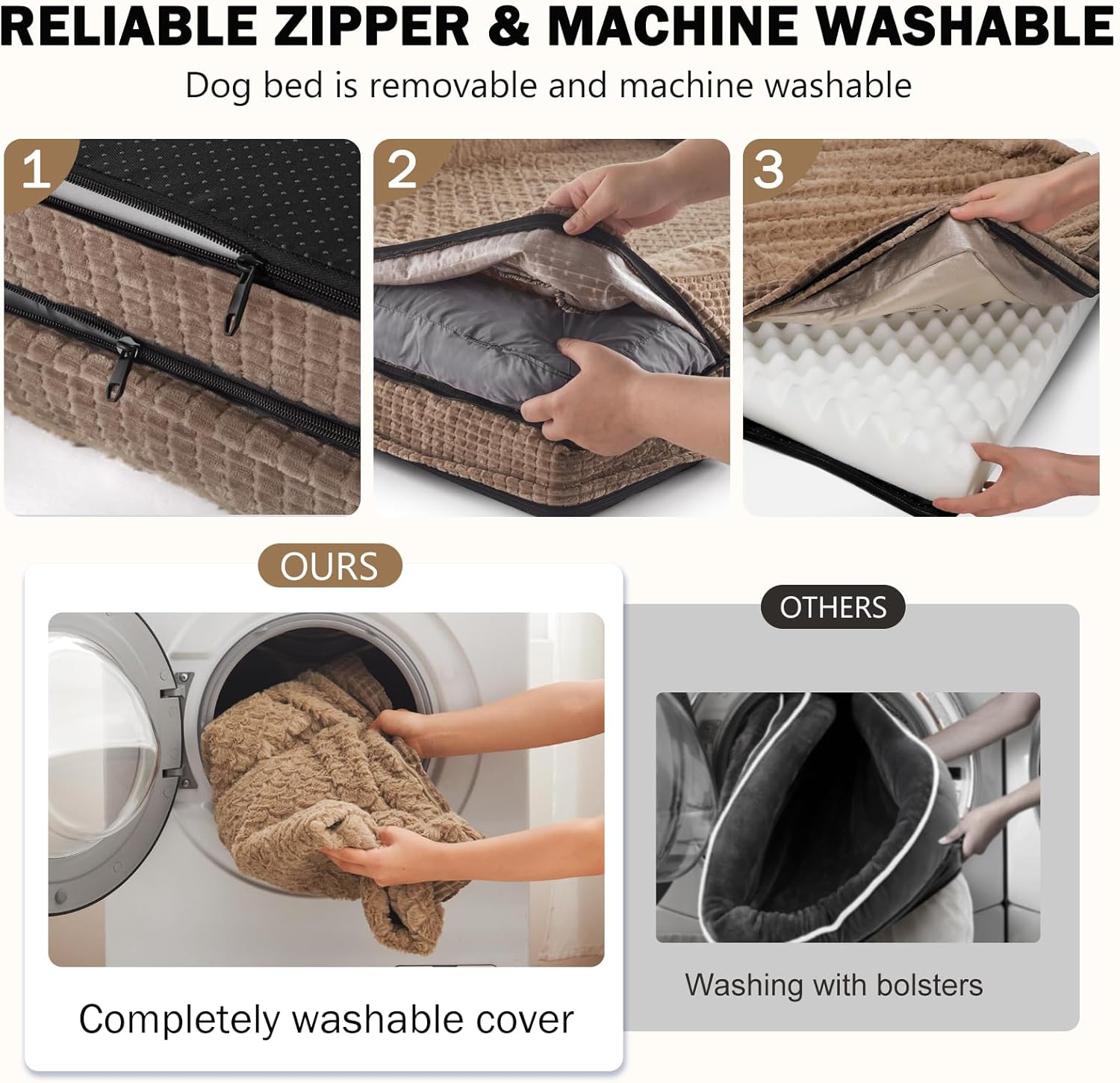 - ๐ถWATERPROOF & WASHABLE DOG BED: The dog bed features a fully removable, machine-washable cover with a smooth double zipper for easy to quick remove and care, so just throw it in the washing machine and will be as good as new, ensuring your pet's space stays fresh and hygienic. The waterproof inner lining on the back of the dog bed cover fully protect the egg crate foam from spills, water damage, or accidents, prolonging the product's life.
