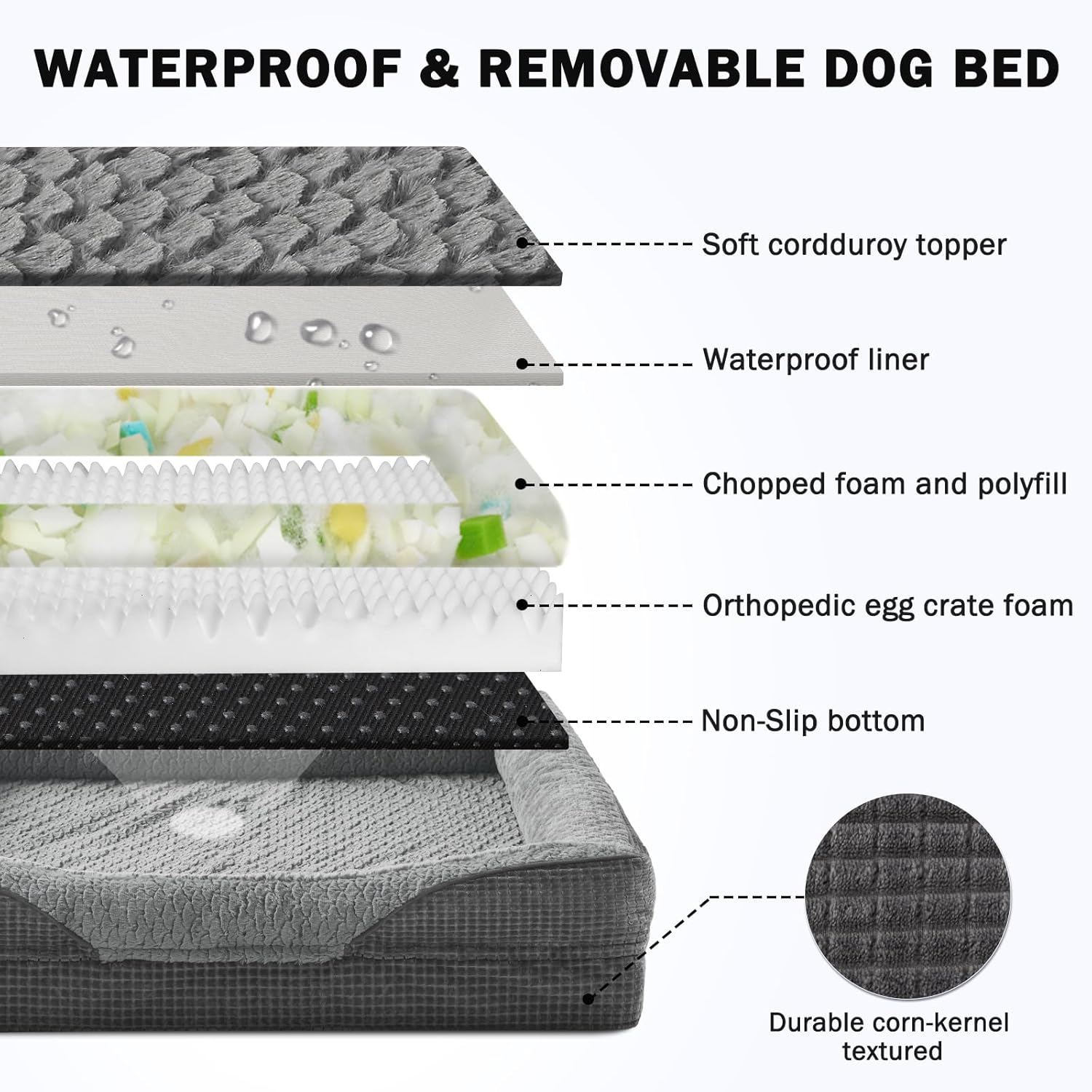 - ๐ถWATERPROOF & WASHABLE DOG BED: The dog bed features a fully removable, machine-washable cover with a smooth double zipper for easy to quick remove and care, so just throw it in the washing machine and will be as good as new, ensuring your pet's space stays fresh and hygienic. The waterproof inner lining on the back of the dog bed cover fully protect the egg crate foam from spills, water damage, or accidents, prolonging the product's life.