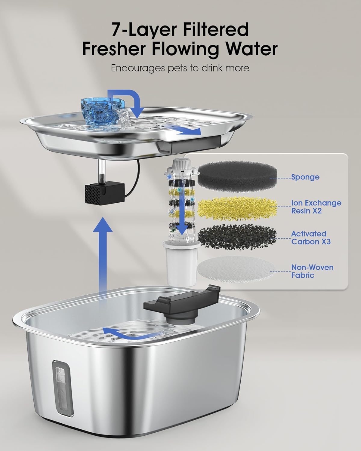 - Advanced 7-Layer Filtration for Clean, Fresh Water: Our dog water bowl fountain features a multi-layer filtration system to keep your pet's water clean and fresh. High-density filter cotton, activated carbon, and ion-exchange resin work together to remove pet hair, dirt, and heavy metals while reducing water hardness and odors. This advanced system improves water taste, encourages hydration, and ensures your pet always has access to healthier drinking water
