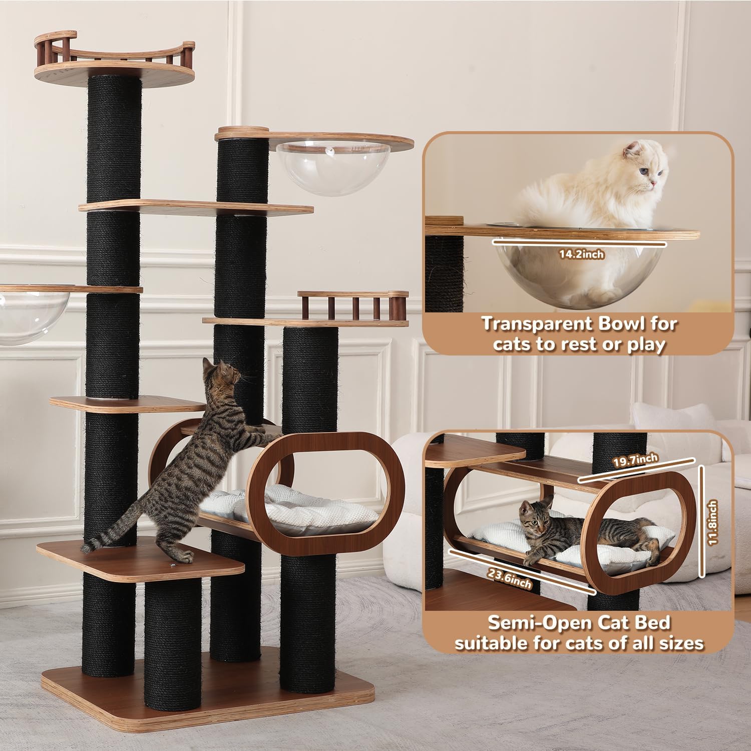 70.8'' Tall Luxury Cat Tree,All i,ne One Black Walnut Wood Modern Cat Tower for Indoor Large,Huge Multi-Level Cat Furniture with Scratching Posts,Condo,Cushion,Clear Bowl,Platform for Home Decoration