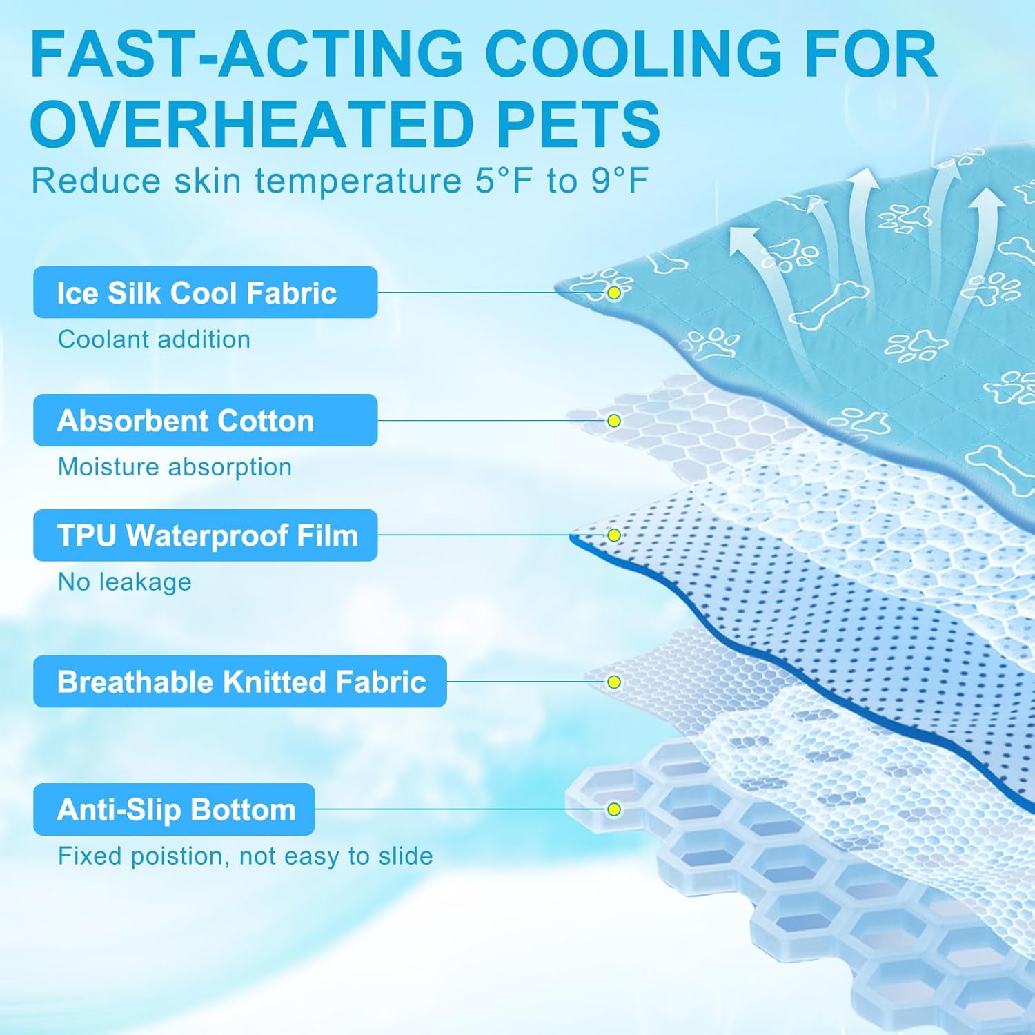 - Elaborate Dog Cooling Mat-- The inner layer of the mat had water absorption material to stay dry, urine and odor control. Besides, our summer dog sleeping pad is extremely breathable. Excellent craftsmanship can ensure self-cooling pet mat is durable enough and chew proof. It's also could be used as a pet pee pad or feeding mat.