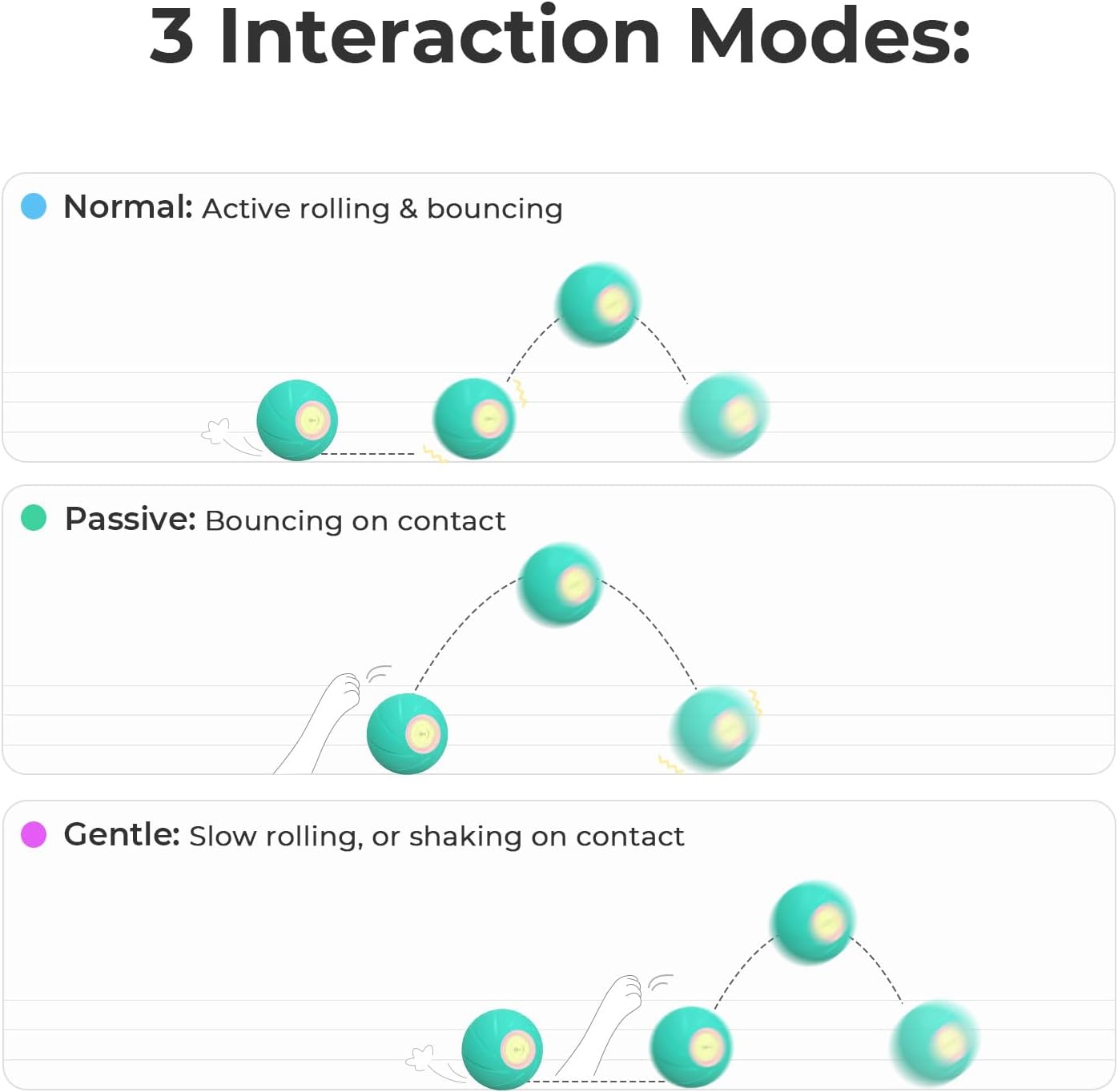 - 【3 Interaction Modes Dog Ball】Hoochii x Cheerble Wicked Ball SE is specially designed for active, bored and timid dogs. It has 3 interaction modes: Normal, Passive, and Gentle mode.Upon being turned on, it will automatically move, shake or bounce, among which you can switch to fit for different dog plays. In the meantime, the cool LED lights will be on when the ball is operating, attracting dogs to chase and capture it, promotes physical exercise and mental health in dogs.