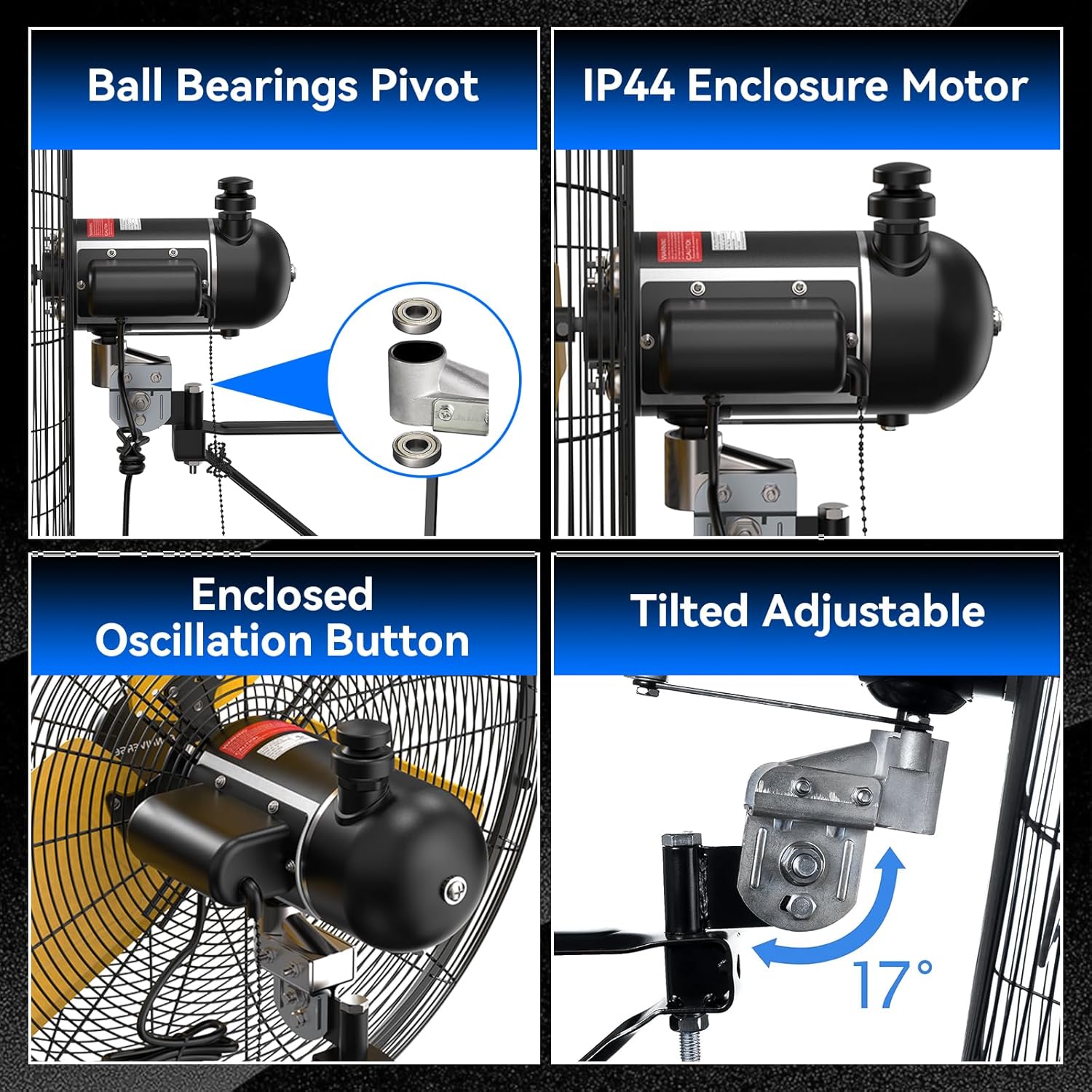 - 𝐇𝐞𝐚𝐯𝐲-𝐃𝐮𝐭𝐲 𝐒𝐭𝐫𝐮𝐜𝐭𝐮𝐫𝐞 - Oscillating fan is sturdy and durable. OSHA compliant grille ensures safety, powder coating for excellent corrosion resistance, ball bearing pivot, equipped with wall mount, metal gear and aluminum blades enhance wind output. Rust-resistant grille ensures long-term safe and worry-free use while easy to clean and maintain.Extra long 6 feet + SIT waterproof power cord, 1/10 HP, 120V, 220 Watts, 60 Hz. UL safety certification