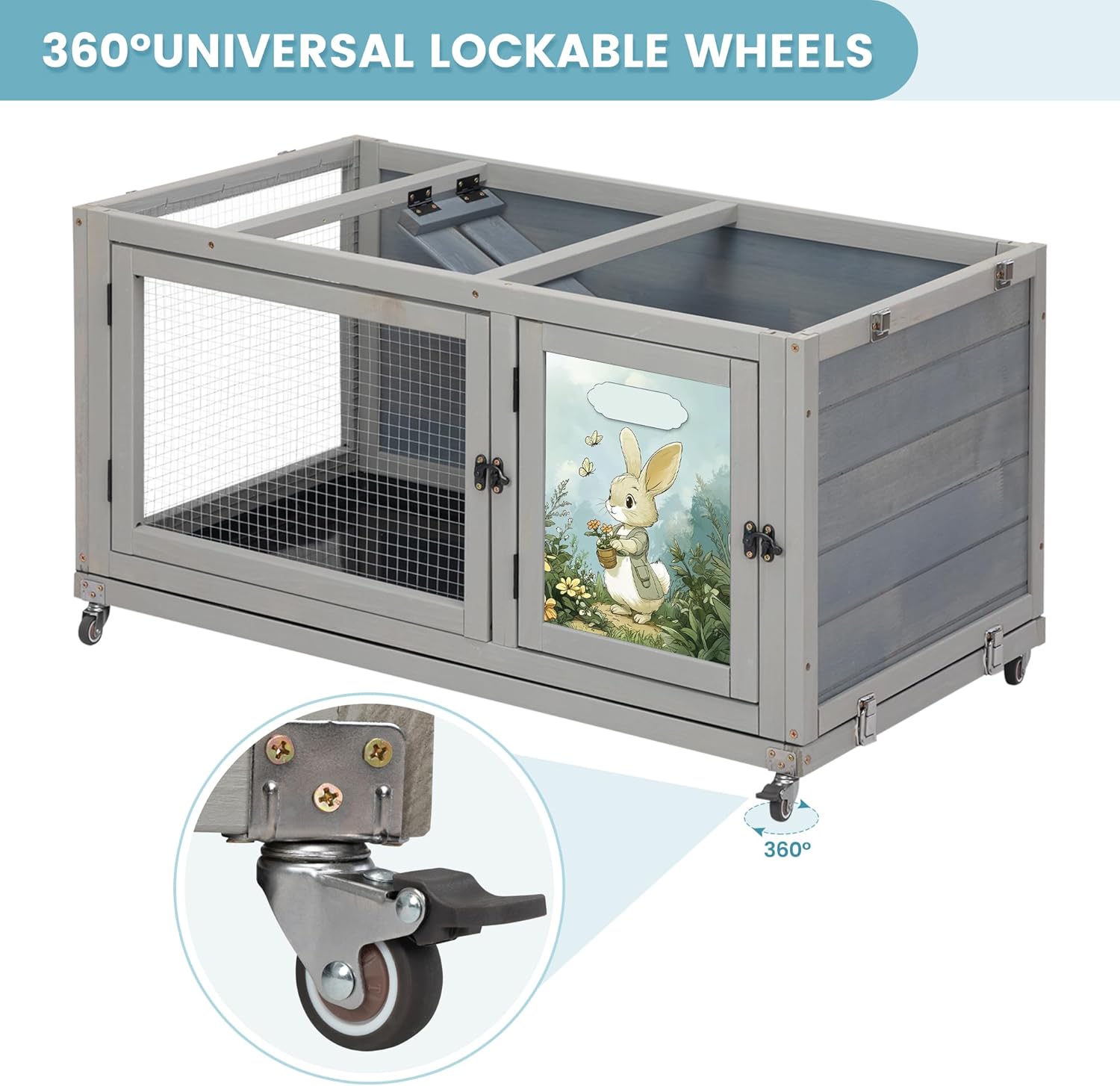 - 【Excellent Mobility】Equipped with 4 swivel wheels, this luxurious two-story Small Animal Home can be easily moved to the garden, lawn, or backyard—wherever your pet loves to be. 2 wheels feature brakes to ensure secure stopping and stable daily use.