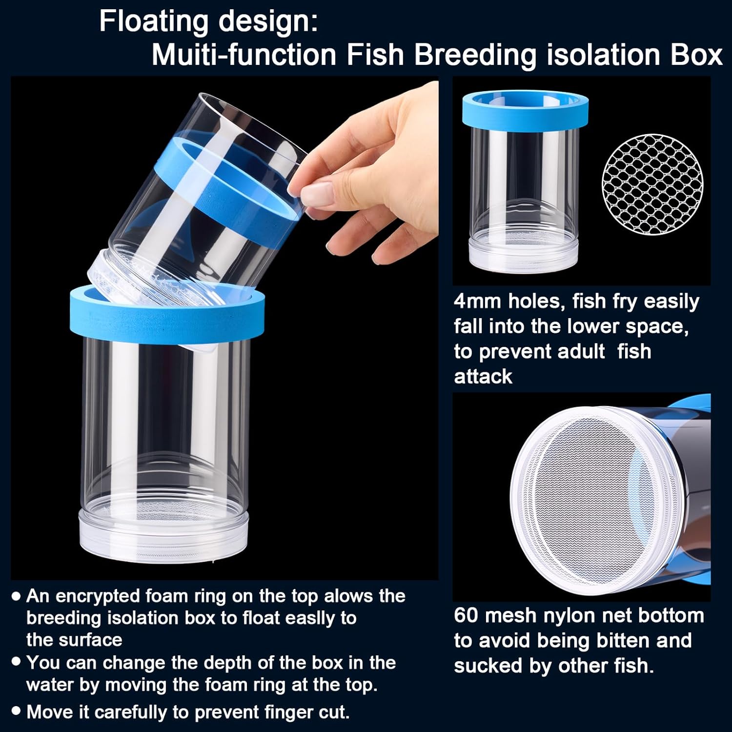 - Versatile and Practical: suitable for a variety of fish, this floating fish breeding box provides a safe and controlled environment for breeding and raising young fish, shrimp or other aquatic species; In addition, it can also be used to isolate injured or aggressive fish