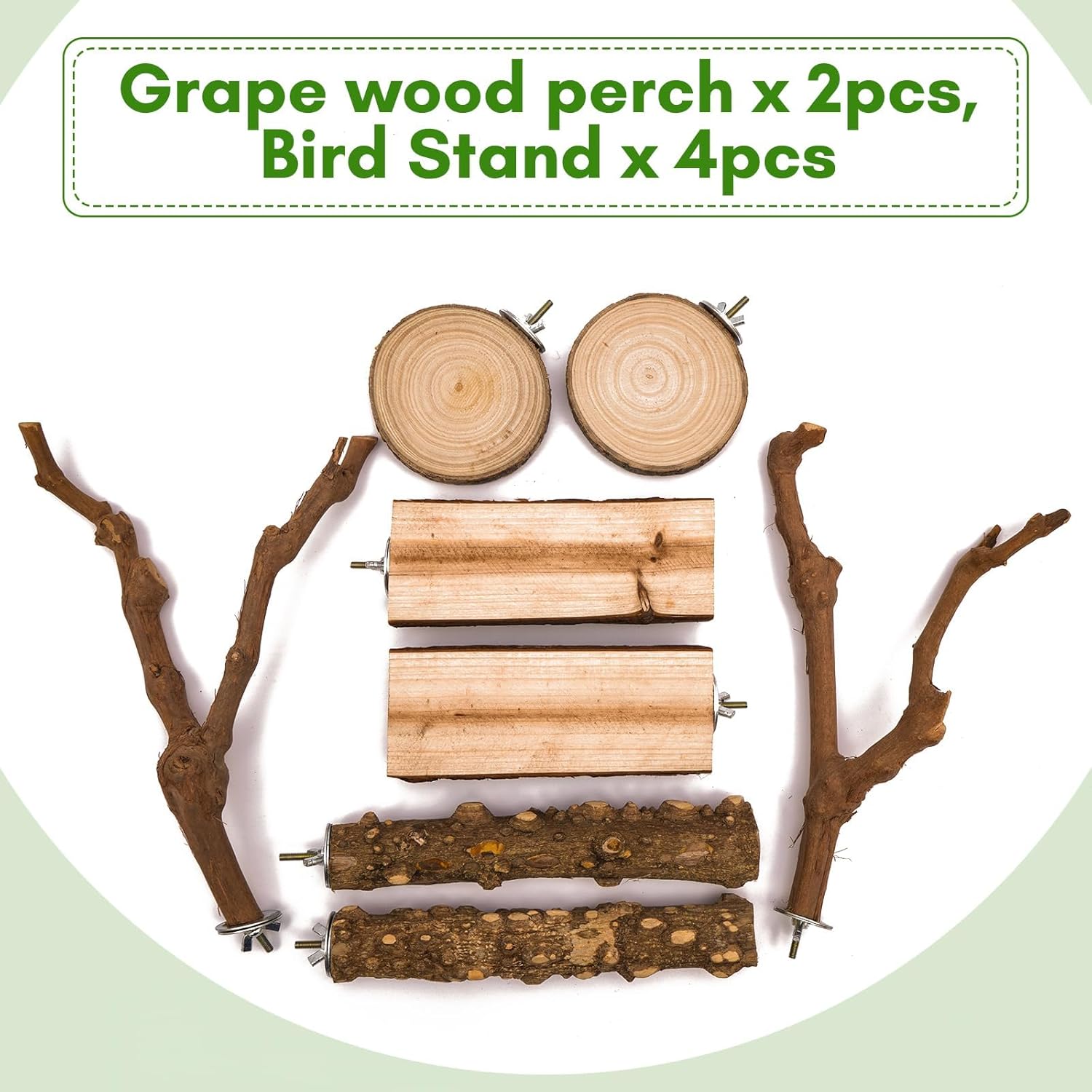- Four Types of Parrot Perches: The EELLAO 8pcs bird perch set includes 2 grapevine claw-grinding perches, 2 long-tail parakeet perches, 2 round platforms, and 2 square platforms to accommodate various types of parrots you keep.