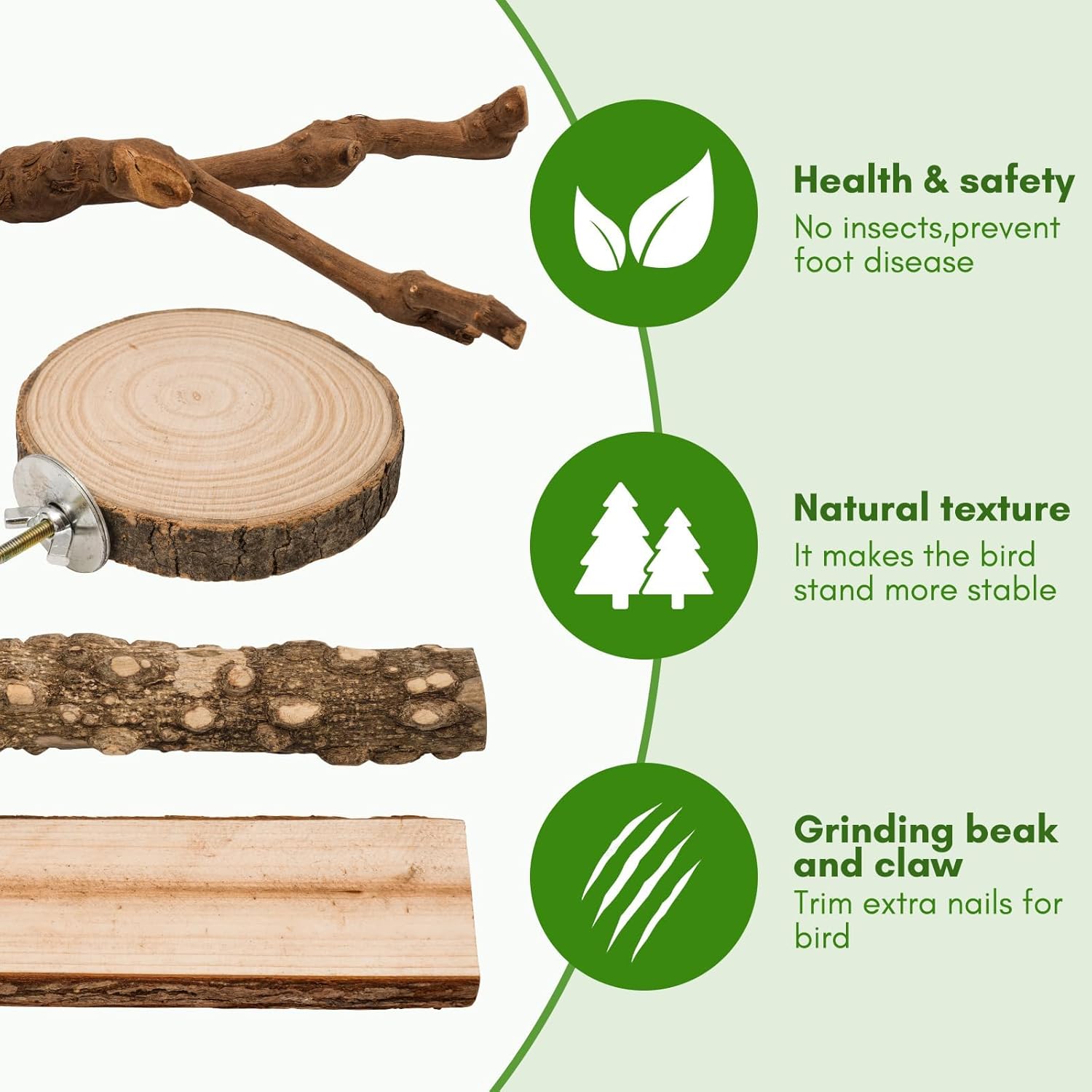- Non-Slip: The bird perches are made from natural wood with visible grain patterns that provide a stable standing surface for birds while also serving as a toy for claw-grinding.