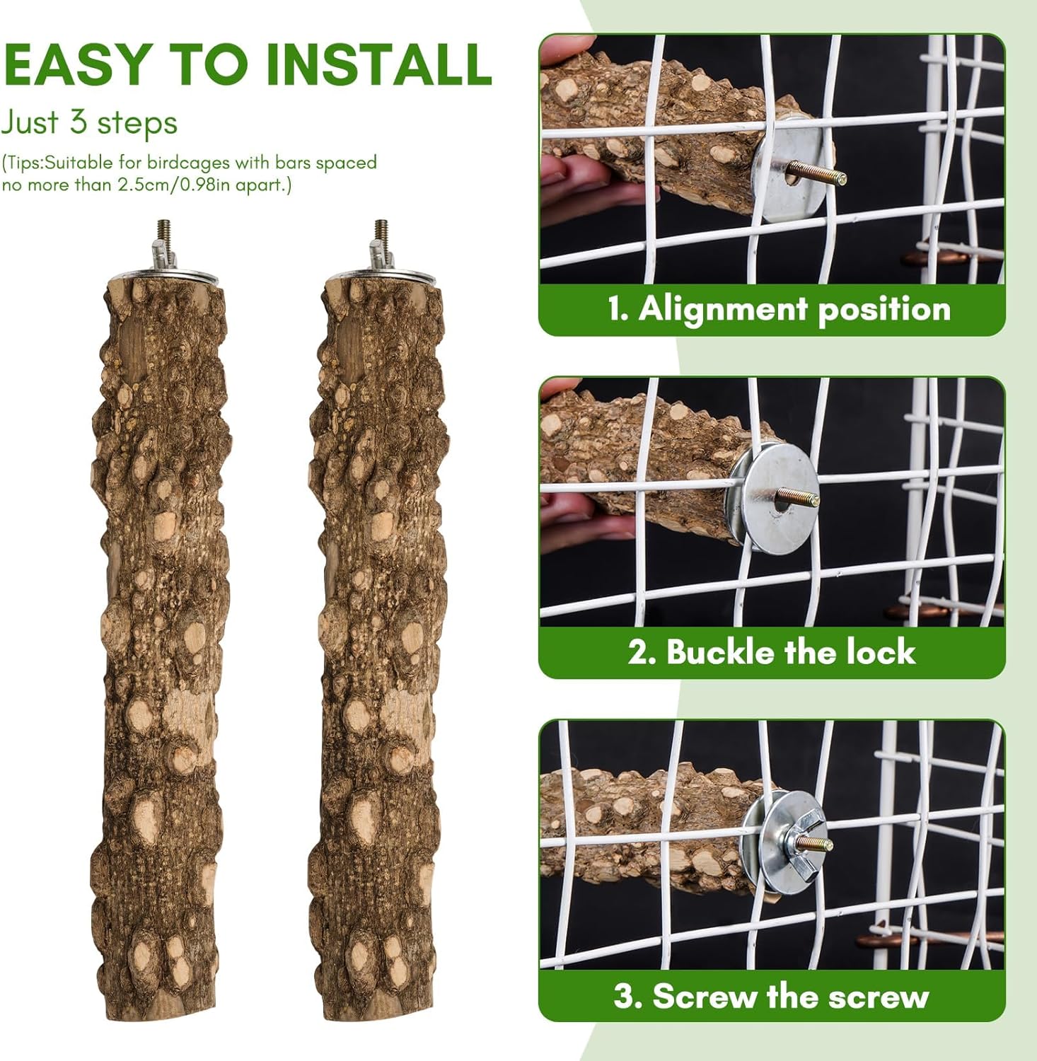 - Natural Wood: Each perch in the EELLAO bird perch set is made from natural wood, cleaned and dried to ensure safety for your pets. Since they're crafted from natural materials, each perch will have its own unique shape and size.