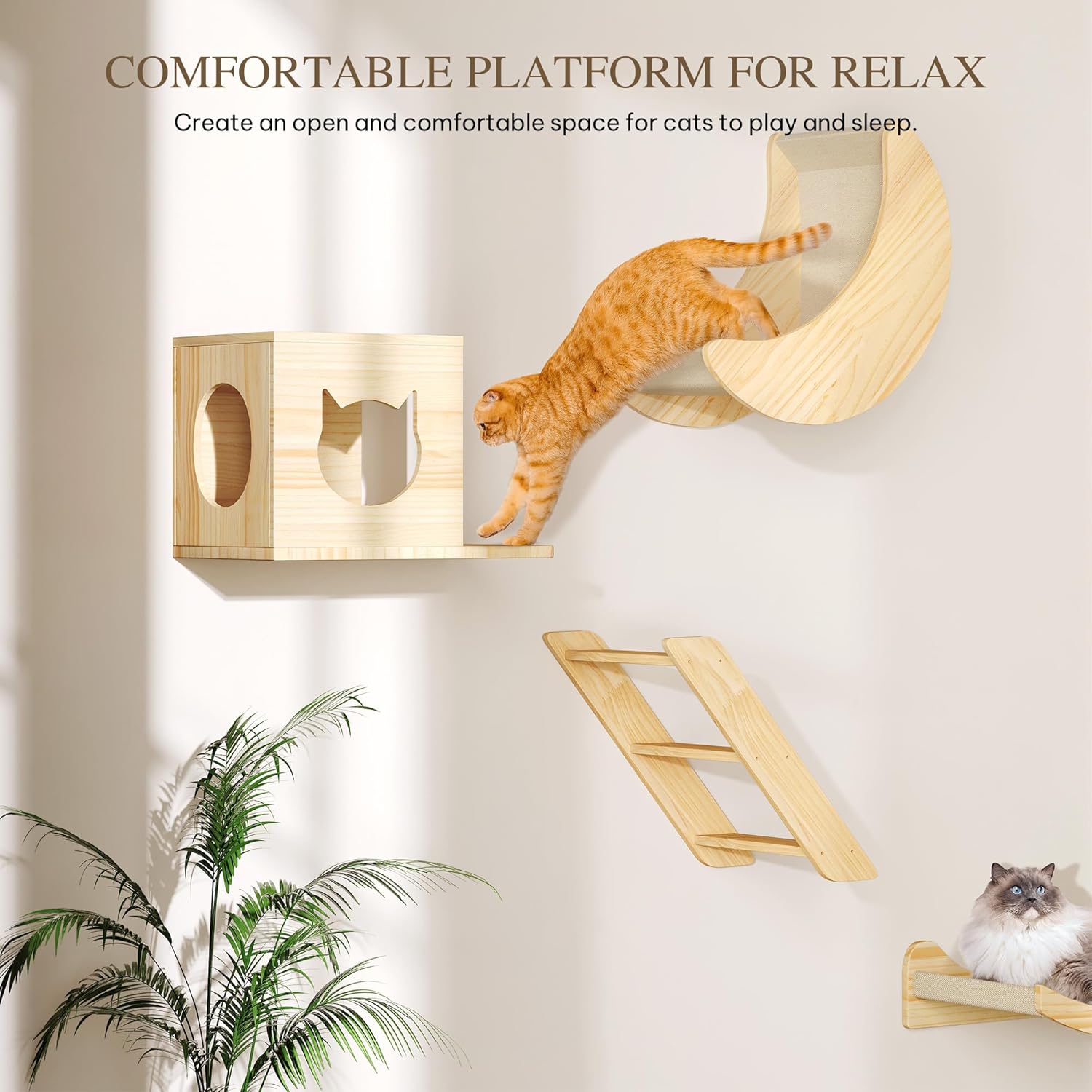 - Wall-Mounted Cat Furniture for Felines: Turn your wall into a cat's dream playground with stylish perches and houses that allow active kitties to climb, lounge, and explore to their heart's content, all while keeping your floor space open and organized.