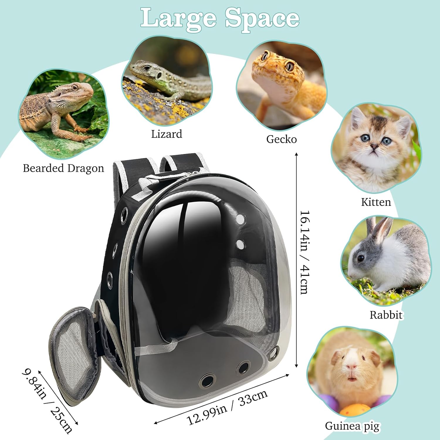- Transparent Bubble Window: The bearded dragon backpack features a transparent bubble window design, allowing you to observe your pet's movements while also enabling your pet to see the outside world, satisfying its curiosity and reducing anxiety. The front hard clear bubble window provides better protection for reptiles in case of accidents, avoiding them from being crushed or attacked