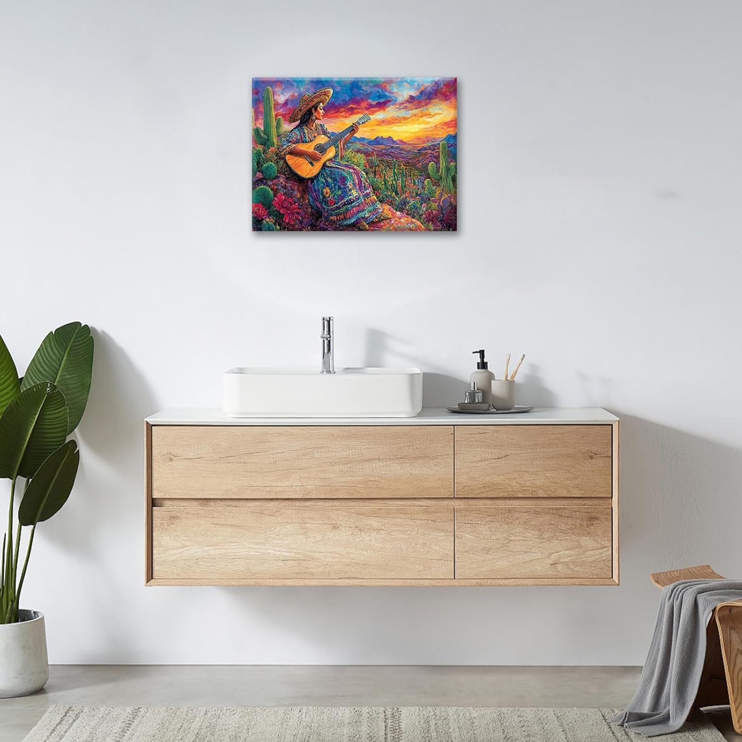 Mexican Women Pictures Wall Art, Cactus Landscape Bathroom Wall Decor, Nature Scenery Aesthetics Framed Painting Desert Modern Canvas Artwork for Bathroom Bedroom Living Room Decorations 24"L x 16"W