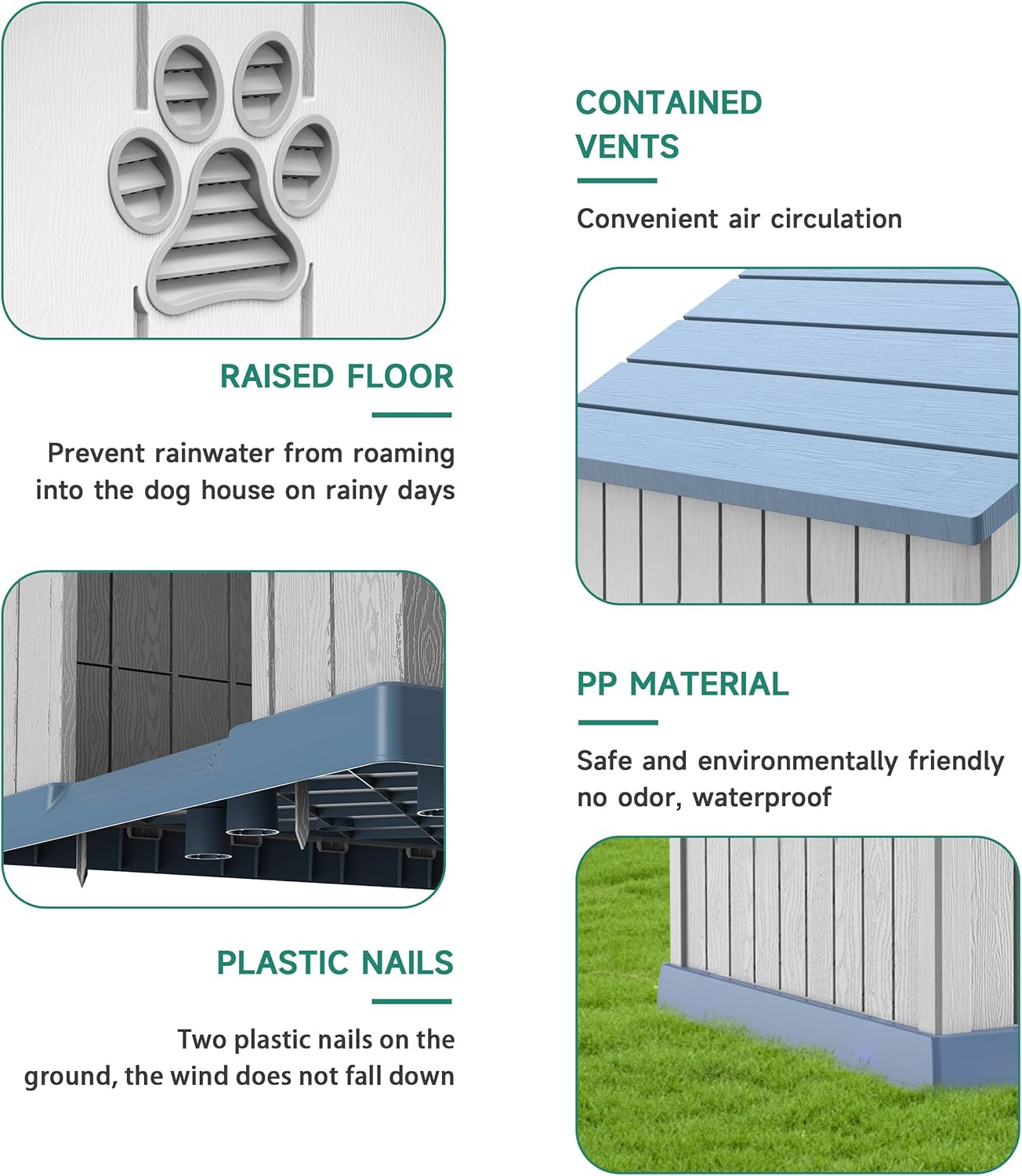 - Strong and Stable: To ensure that the dog house is stable and reliable, we have equipped it with plastic nails. These pegs can firmly fix the dog house on the grass, preventing it from moving easily due to your dog's activities or external factors such as wind.