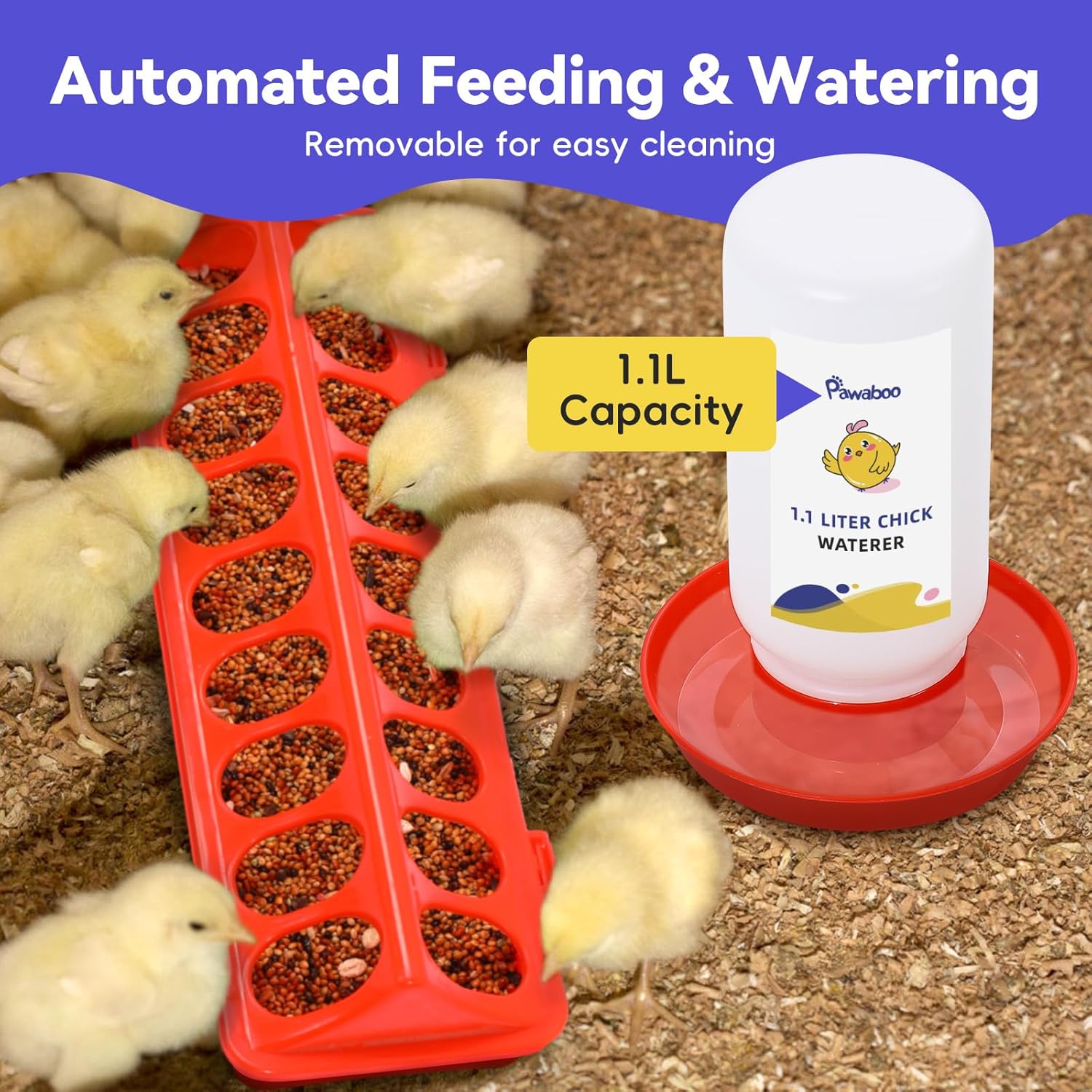 - 【Meet Water Drinking Needs】 1.1L plastic chicken waterer (8.3" x 5.9"), sturdy and reusable, enlarged tray is convenient for chicks to drink water and keep chicks moving around the waterer in an orderly manner. Also can be detached, convenient to clean.