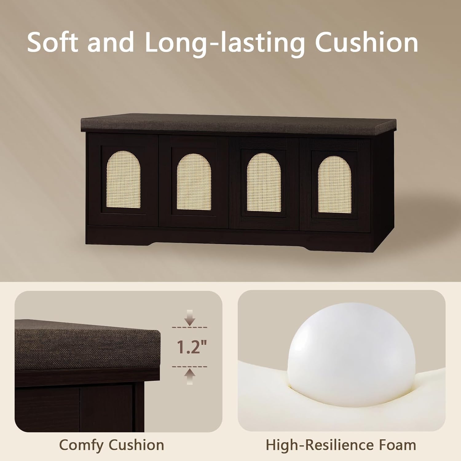 DINZI LVJ Shoe Bench, Entryway Storage Bench with Doors, Cushion, 2-Tier Shoe Rack with 8-Cubby, 47.2”L x 13.8”W Shoe Organizer Cabinet, Adjustable Shelf, Living Room, Bedroom, Espresso with Rattan