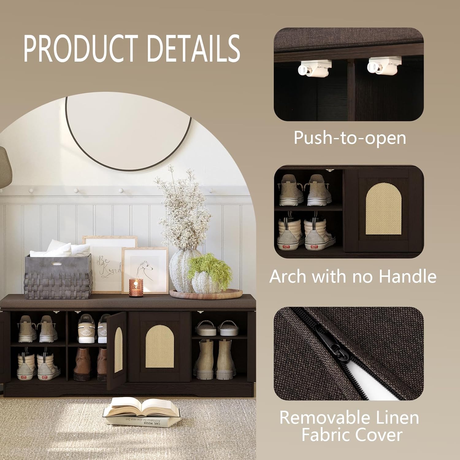 - 【Effortless Push-to-open Door】Feature a fully enclosed design with a press-to-open mechanism, keeping shoes clean and tidy while avoiding accidental bumps against door handles during use. Reasonable height and soft cushion let you change shoes by sitting on the bench more comfortable without bending down or squatting