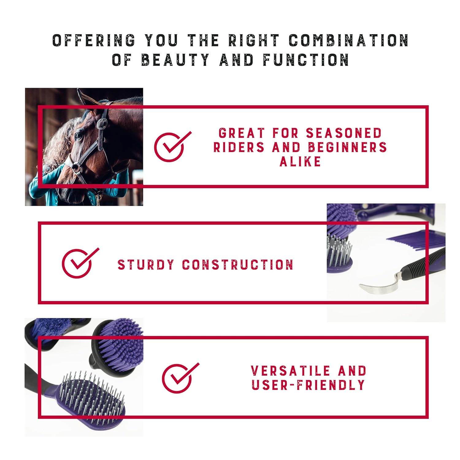 - Horse Grooming Kit: Ensure effortless cleaning and grooming of your horses with our horse grooming set; these 6-piece horse essentials include a comb, hoof pick, palm-held brush, mane and tail brush, dandy brush, and sweat scraper/coarse curry combo