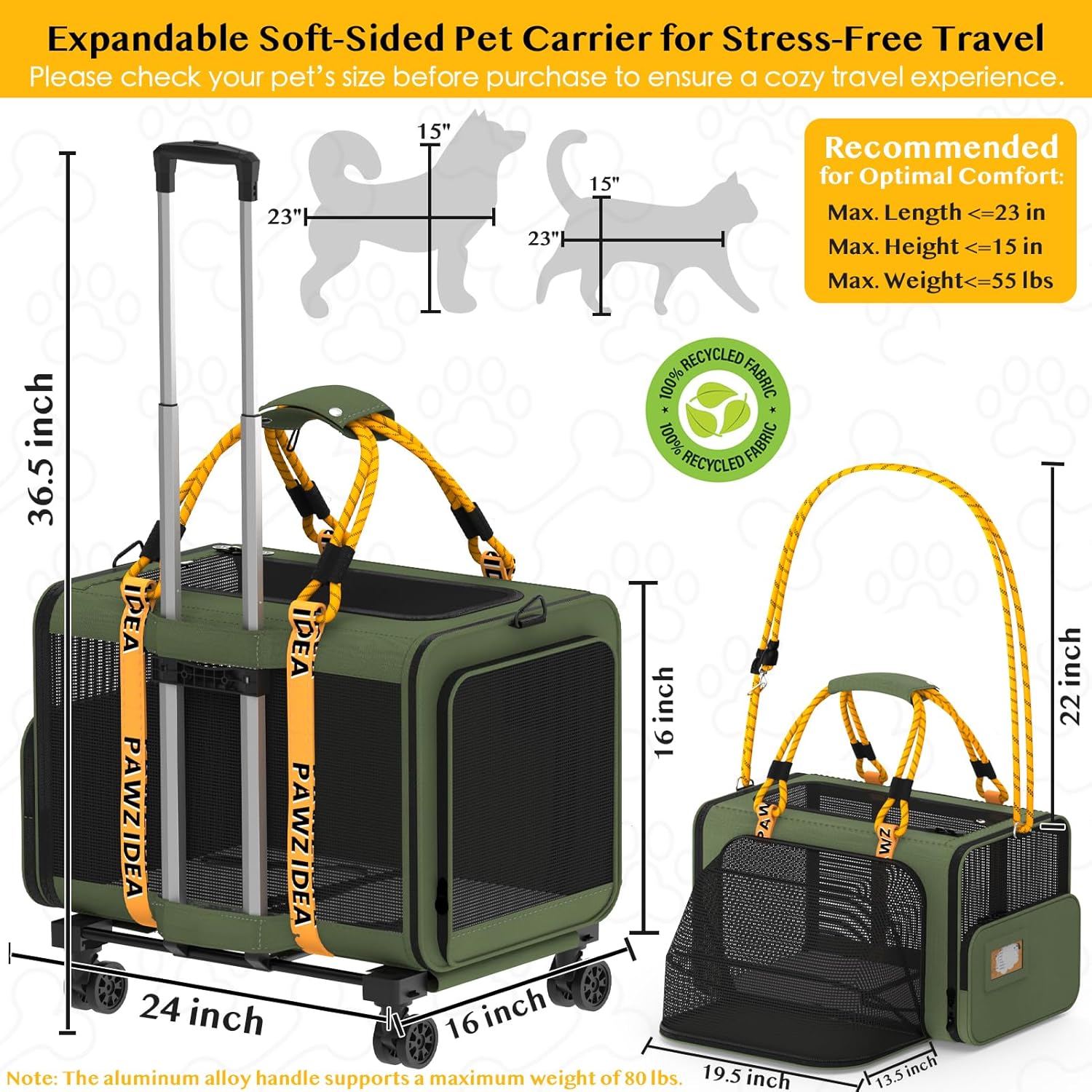 - Expandable for Spacious Comfort —Zip open the front to double the space, comfortably fits 2 large cats or a small/medium dog on long trips. Soft-sided pet carrier (24x16x16in) ensures your pet can stretch and relax. Rolling design makes it perfect for outdoor travel, airport, or daily vet visits.