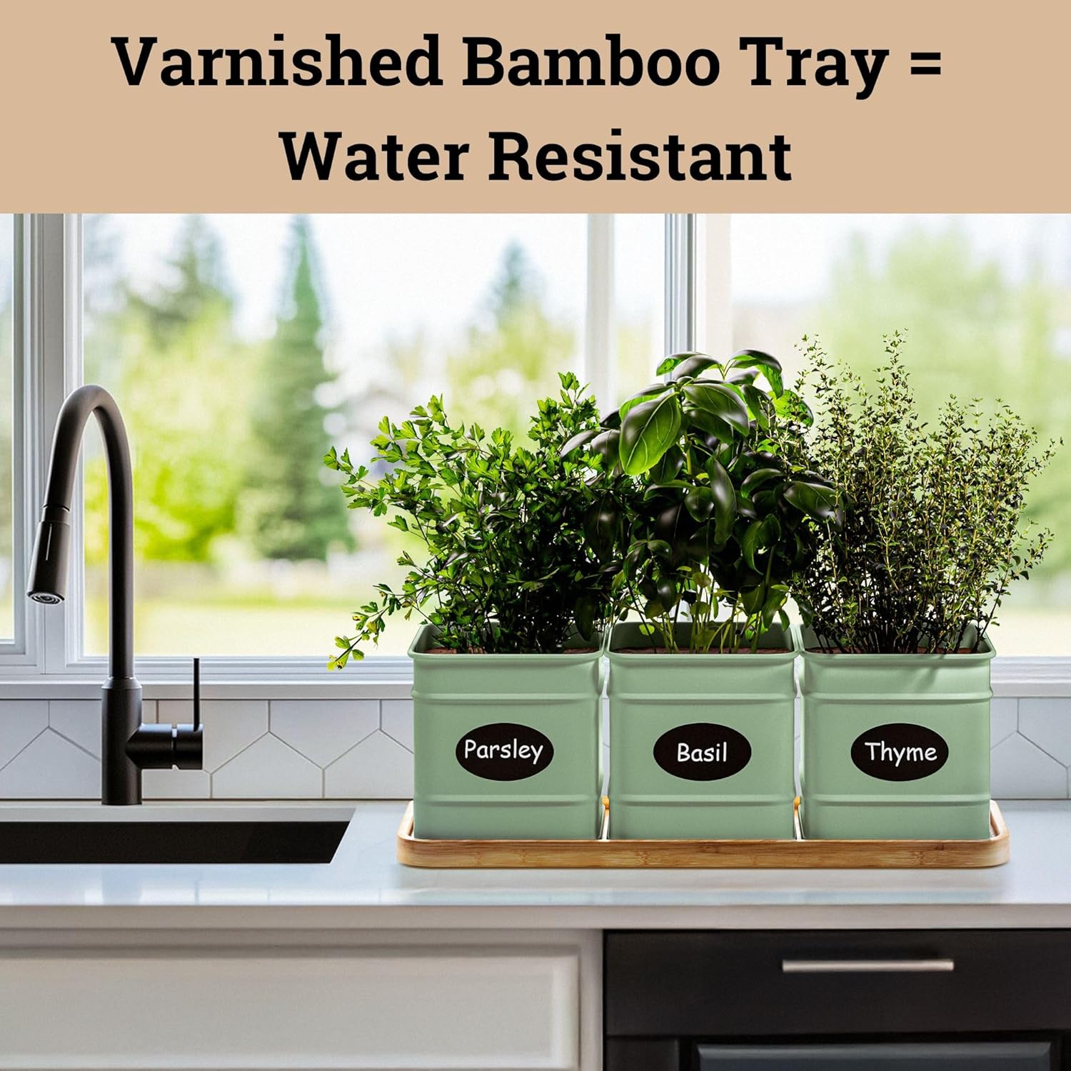 Herb Planter Indoor - 3 Iron Herb Pots with Drainage Holes, Varnished Bamboo Tray, Customizable Labels & Marker Pen - Indoor Herb Garden Planter - 3 Pots for Herbs - Inside Spice Garden - Basil Pot