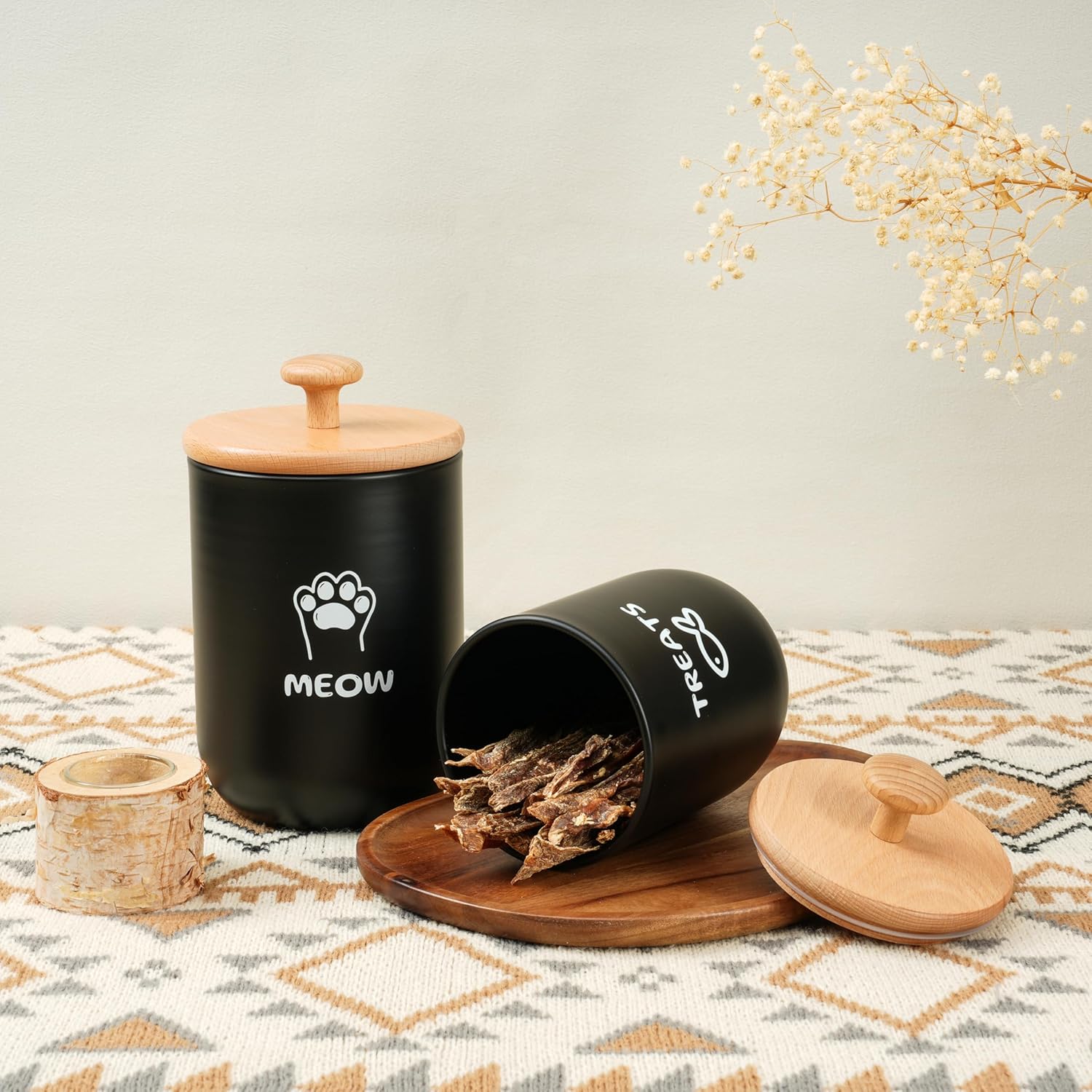 - Airtight Wooden Lids for Freshness – Equipped with airtight lids and stylish wooden tops, these cat treat jars for kitchen counter effectively block air and moisture, keeping your pet's treats fresh and crunchy. No more worries about stale or spoiled snacks—every bite stays delicious!