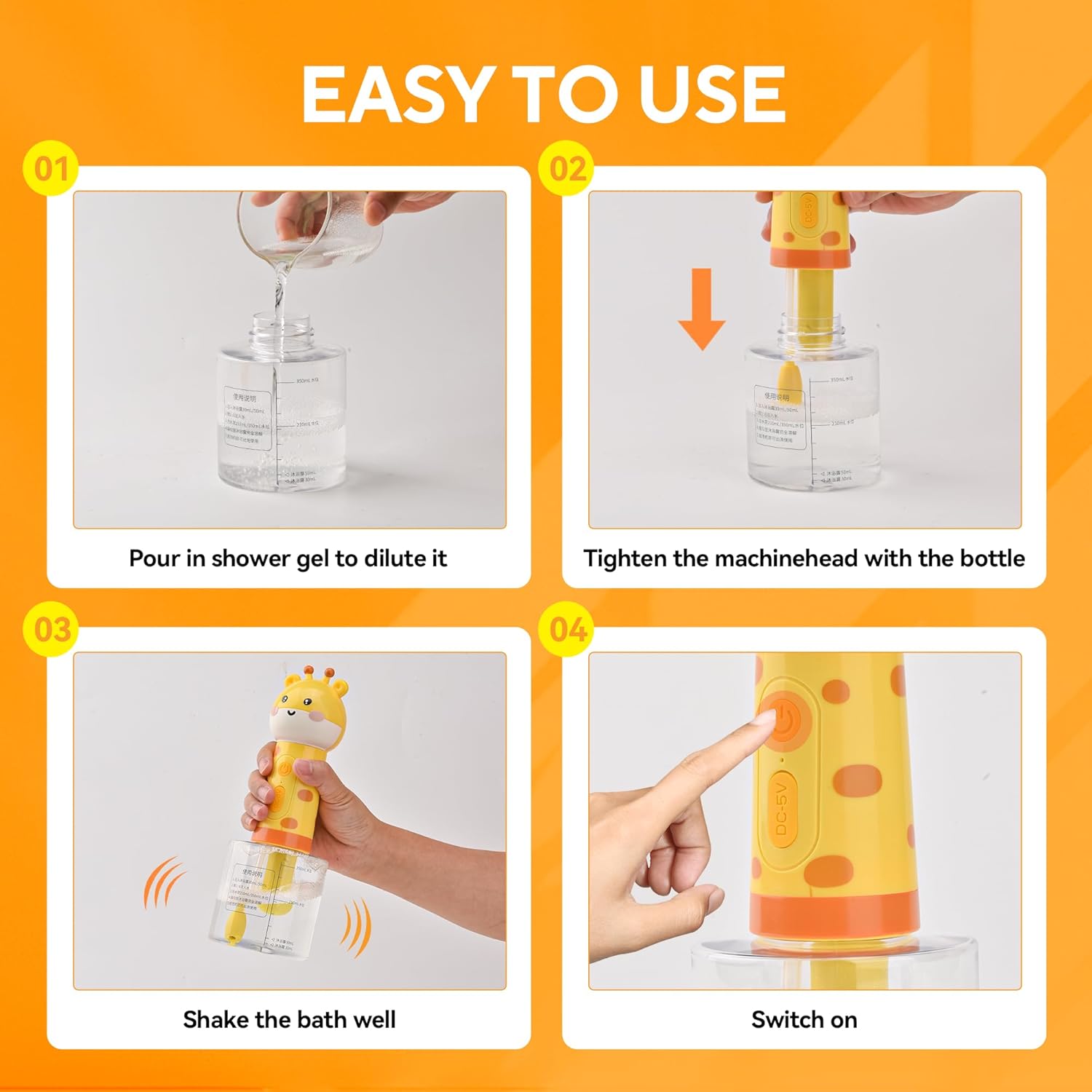 - 1.1-Second Foam Magic - No Mixing, No Mess! Simply add shampoo + water (follow bottle markings), shake gently, and press the button - our system instantly generates rich, spa-grade foam for deep cleaning. The included bath glove boosts scrubbing power while being gentle on skin.