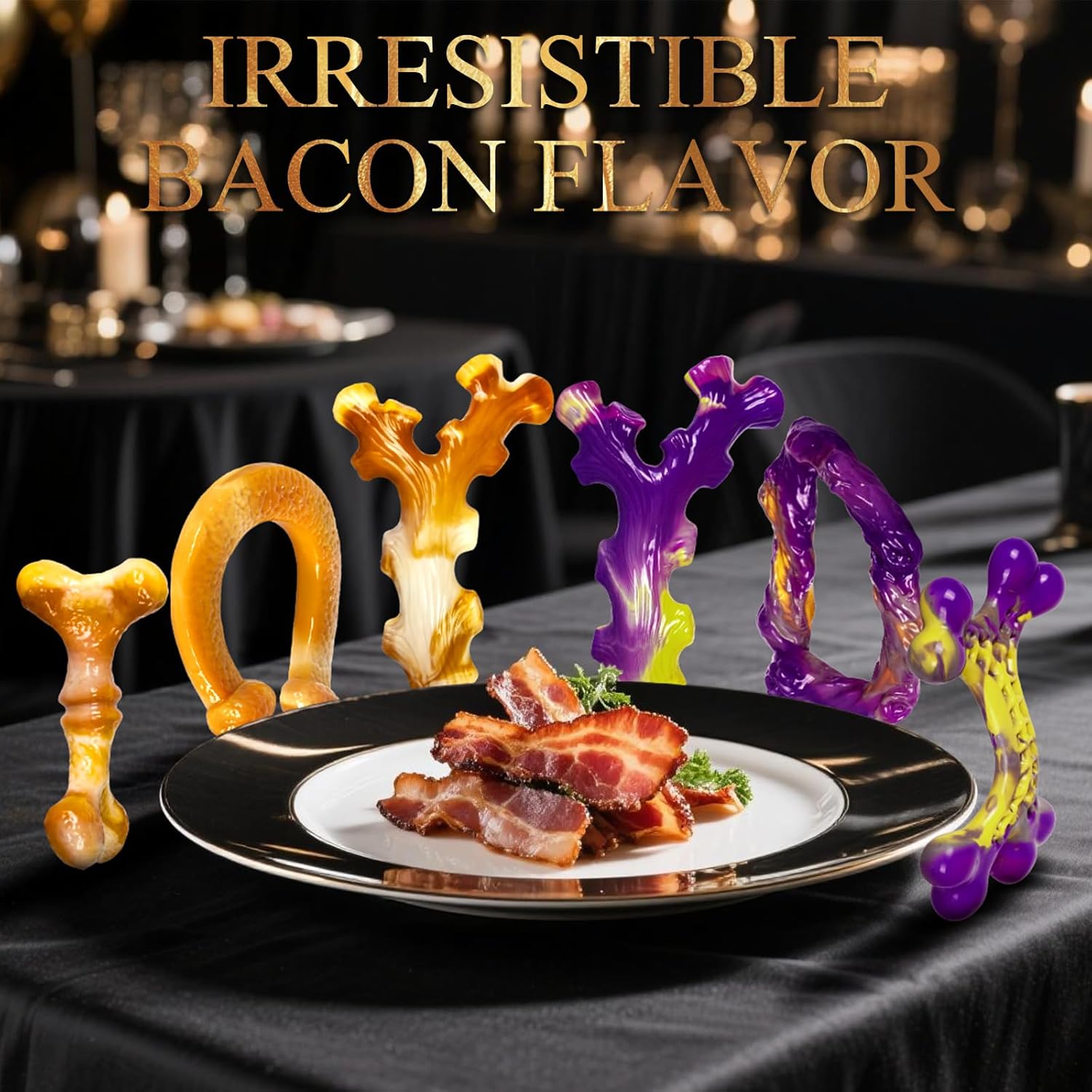 - AUTHENTIC BACON ESSENCE · IRRESISTIBLE BY DESIGN Our 6-pack features real bacon-infused nylon, specially crafted for large breeds. Watch as the savory aroma captivates your pup’s senses, transforming idle energy into focused play.
