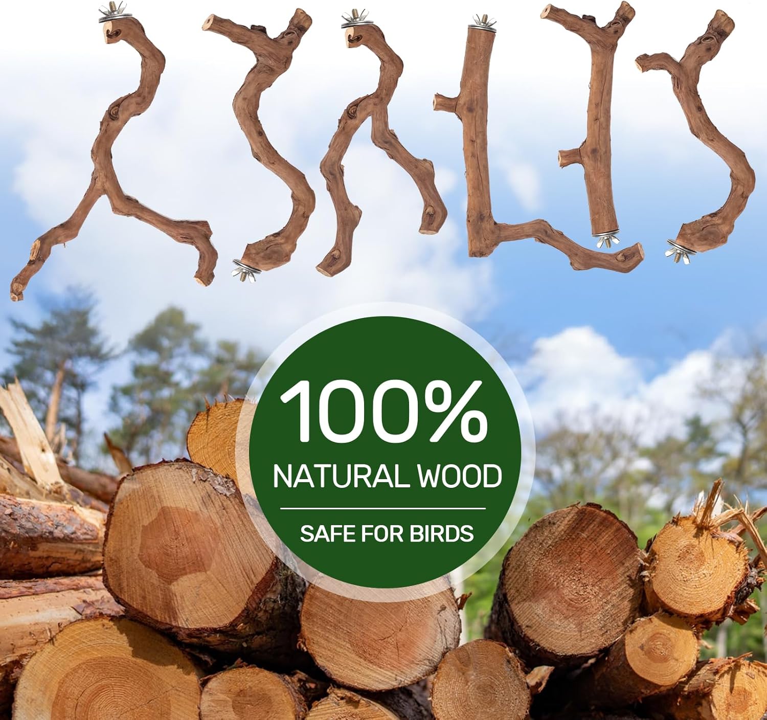 6-Piece Premium Bird Perch Stand with Natural Grape Wood Branch, Paw Grinding Fork, Chewing Stick, Cage Accessories for Parakeets, Budgies, Cockatiels, Finches, Lovebirds