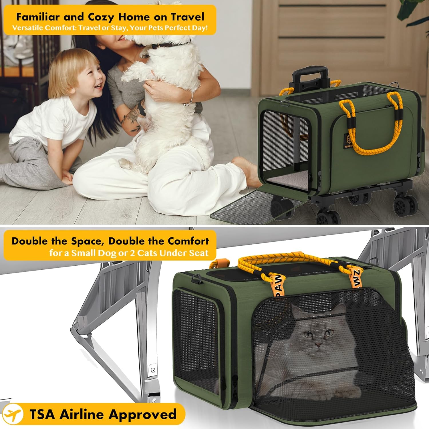 - Expandable Pet Carrier: Zip open the front side to give your pet double the room to stretch and relax. Soft-sided cat carrier airline approved underseat measures 18x11x11 inches, the rolling cat carrier with wheels allows you to easily handle long journeys.