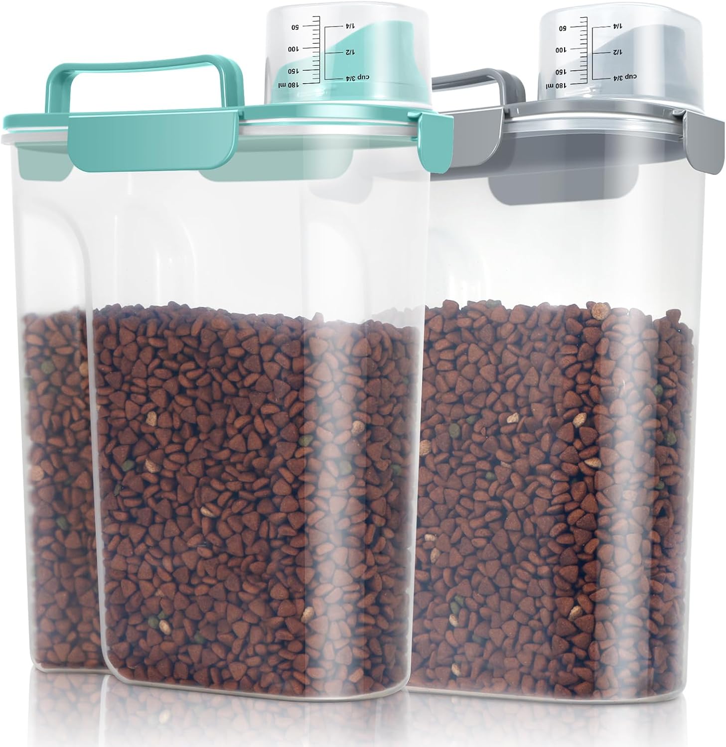 - Large Pet Food Container Set: TBMax dog food storage containers come with two 6-qt bins that each one can hold about a 5 to 7 lbs bag of dry dog food or cat food, which depending on the particles of the pet food. Ideal for storing small pet food like kitten puppy kibble, bird seeds, fish food and more