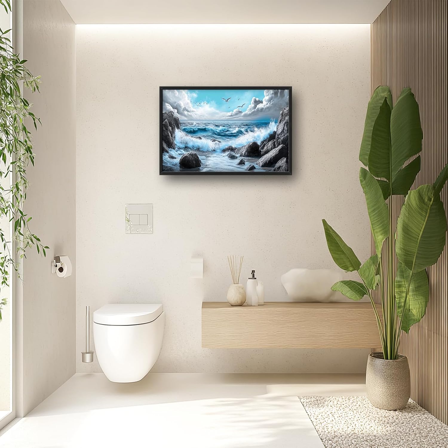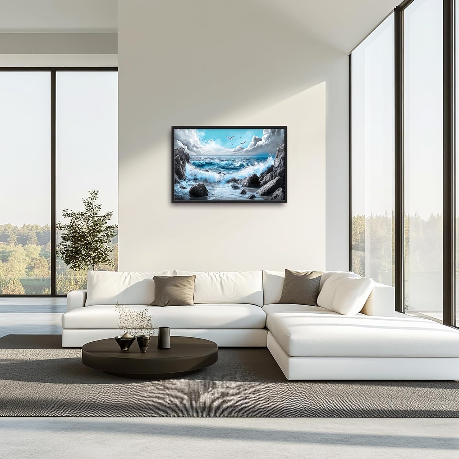 - 【Unique Design】 A stunning ocean scene with crashing waves, rocks, and seagulls in the sky. The blue sea, white clouds, rocks, seashore, sea foam, seashells, waves splashing on the shore, and a blue sky create a breathtaking landscape. The black rocks and stones contrast with the blue waves and water, resulting in a serene and captivating scene.