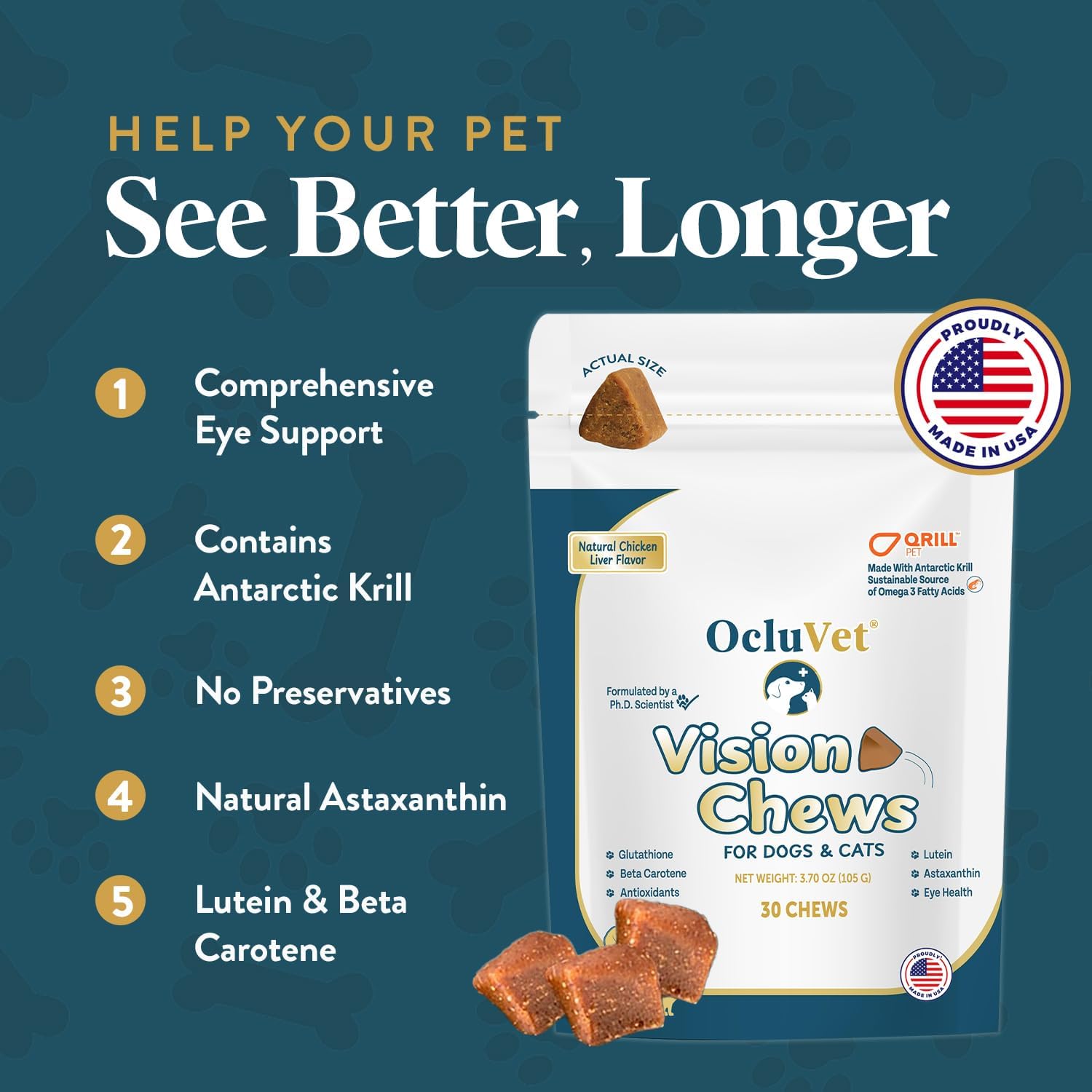 - Premium Ingredients: We use Qrill Pet and Antarctic Krill to give your pet the finest nature has to offer; Our dog vision supplement is packed with Omega-3s and Astaxanthin, ingredients that can help protect and nourish their eyes, while also caring for the planet!