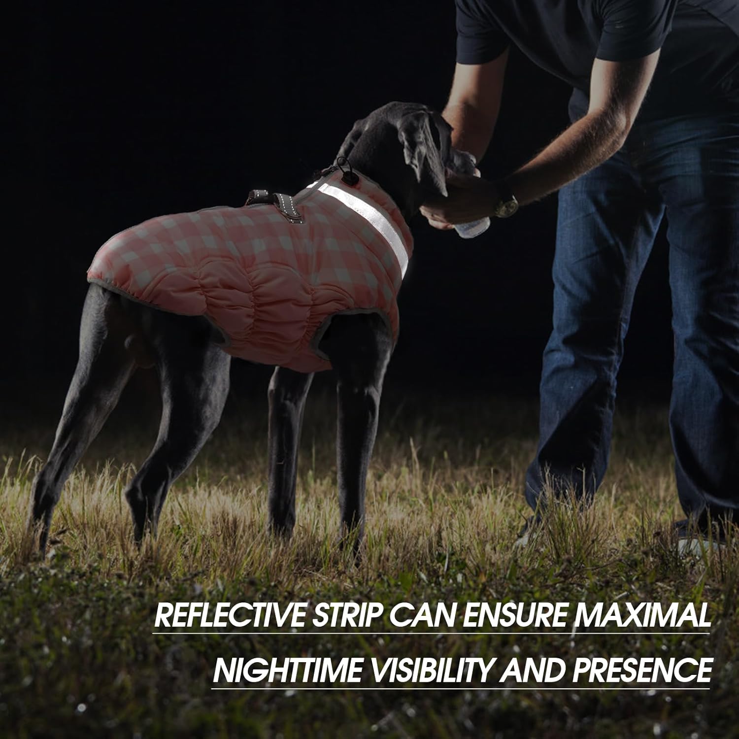 FUAMEY Dog Coat for Large Dogs,Waterproof Dog Winter Jacket with Harness Built in Puppy Cold Weather Coats Reflective Pet Vest with Zipper Warm Fleece Dogs Snowsuit Windproof Pink Plaid 2XL