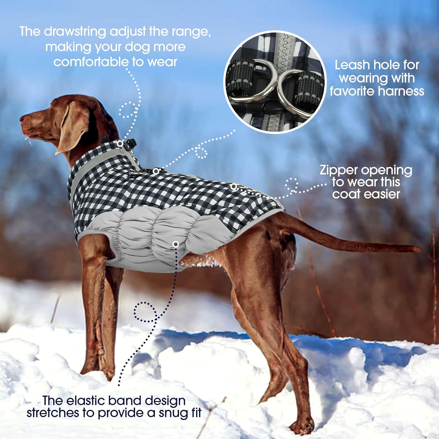 FUAMEY Dog Coat for Large Dogs,Waterproof Dog Winter Jacket with Harness Built in Puppy Cold Weather Coats Reflective Pet Vest with Zipper Warm Fleece Dogs Snowsuit Windproof Checkerboard 3XL