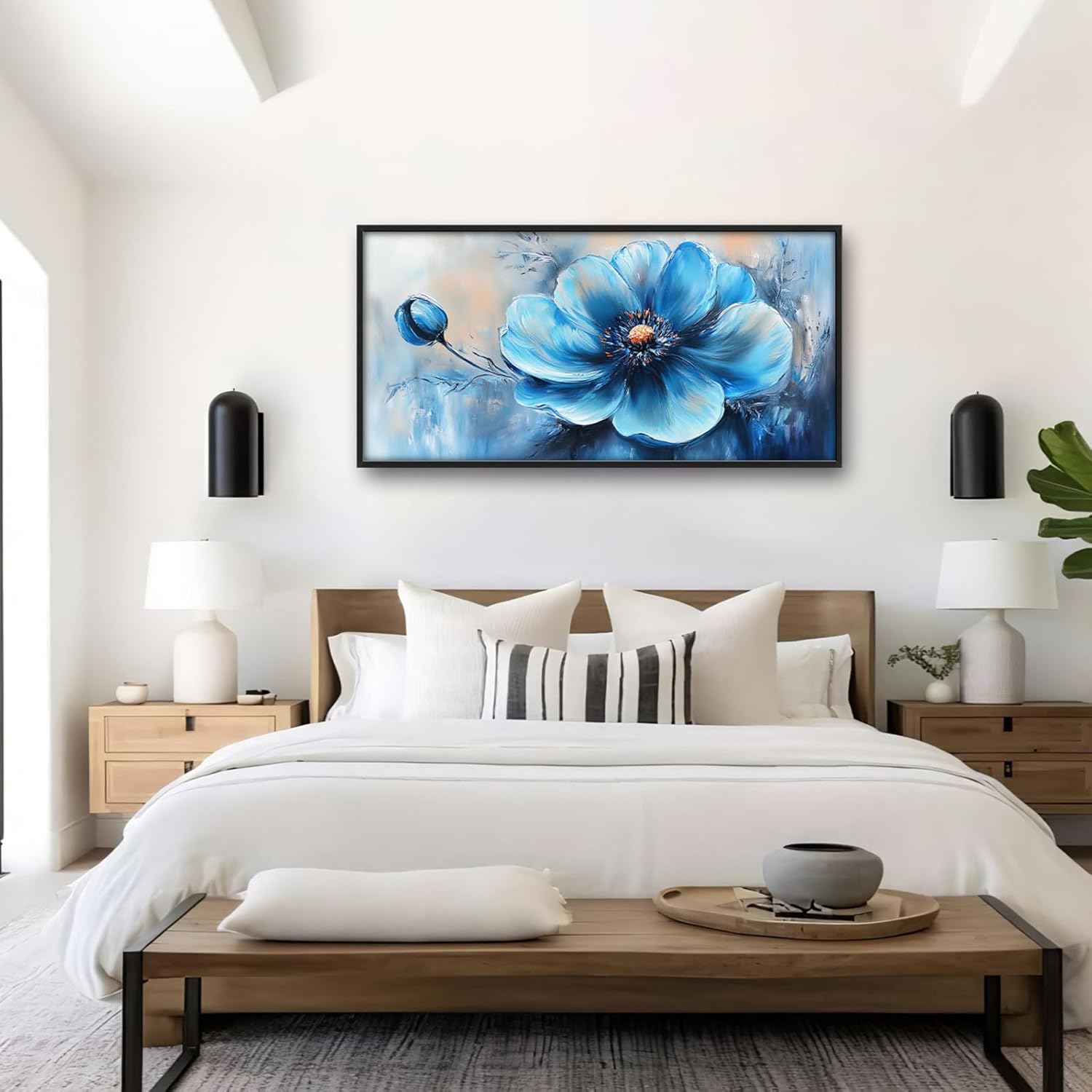 Extra Large Abstract Blue Flower Framed Wall Art for Living Room,Oversized Elegant Floral Pictures Wall Decor,Canvas Print Painting Modern Artwork Bedroom Office Bathroom 60L" x 30W"