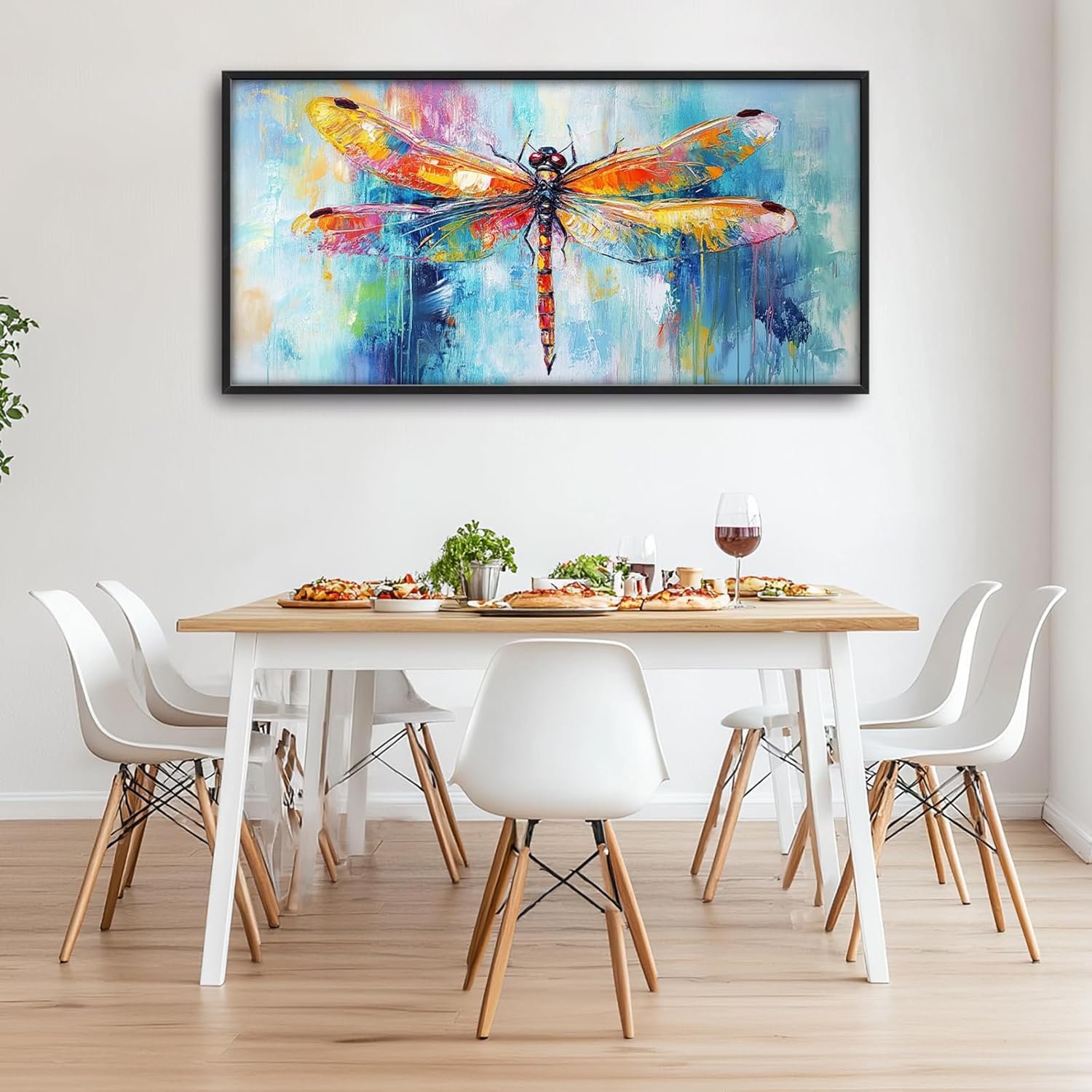 - 【Unique Design】 Colorful dragonfly painting, with vibrant colors and a colorful background, created using oil paint and detailed brush strokes. The large wings of the dragonfly are spread out, showcasing the bright colors.