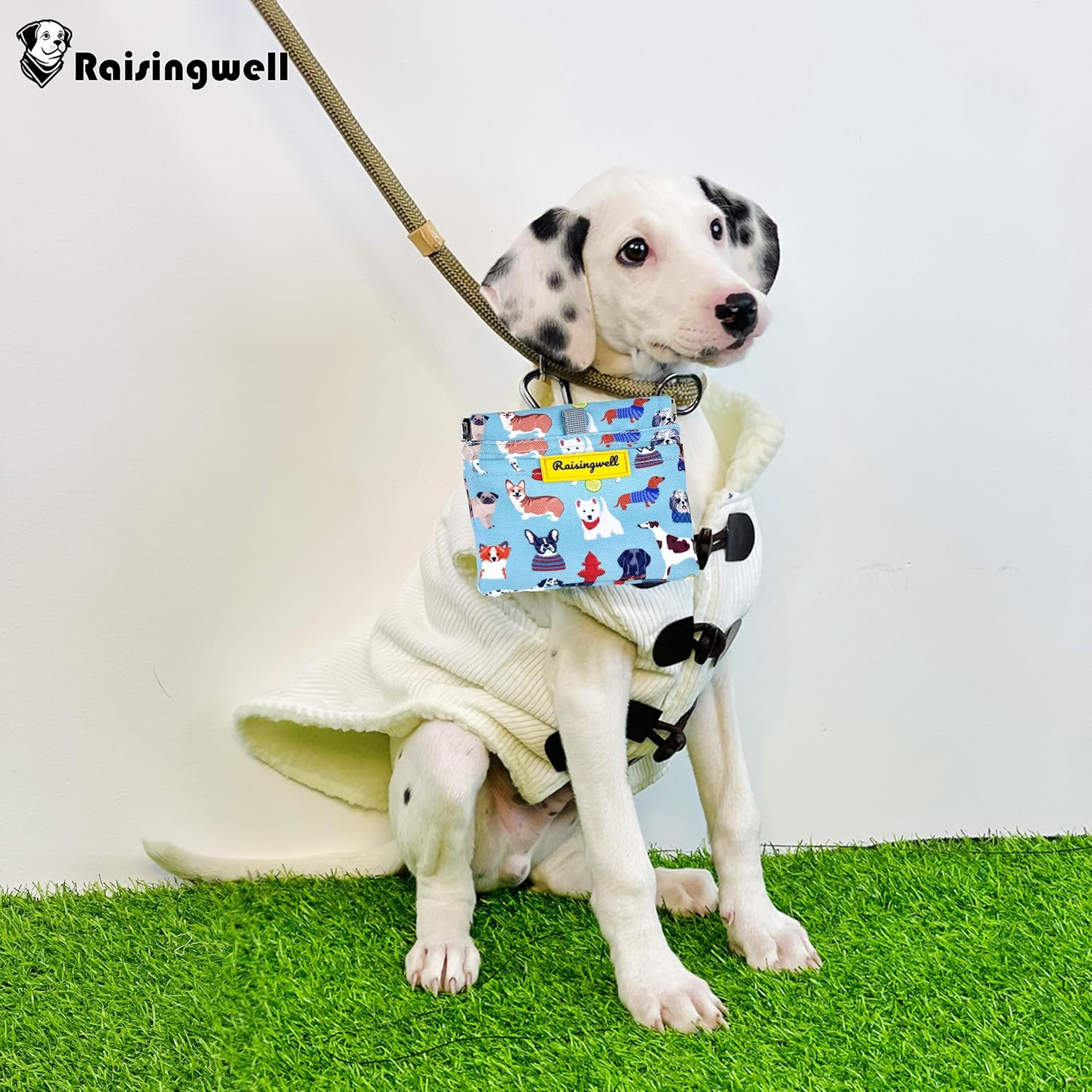 - Durable Material: Raisingwell's dog treat training pouch is crafted from durable, washable, non-toxic vegan fabric, made of pure cotton. In particular, the waterproof lining addresses the issue of difficult cleaning inside the training pouch.