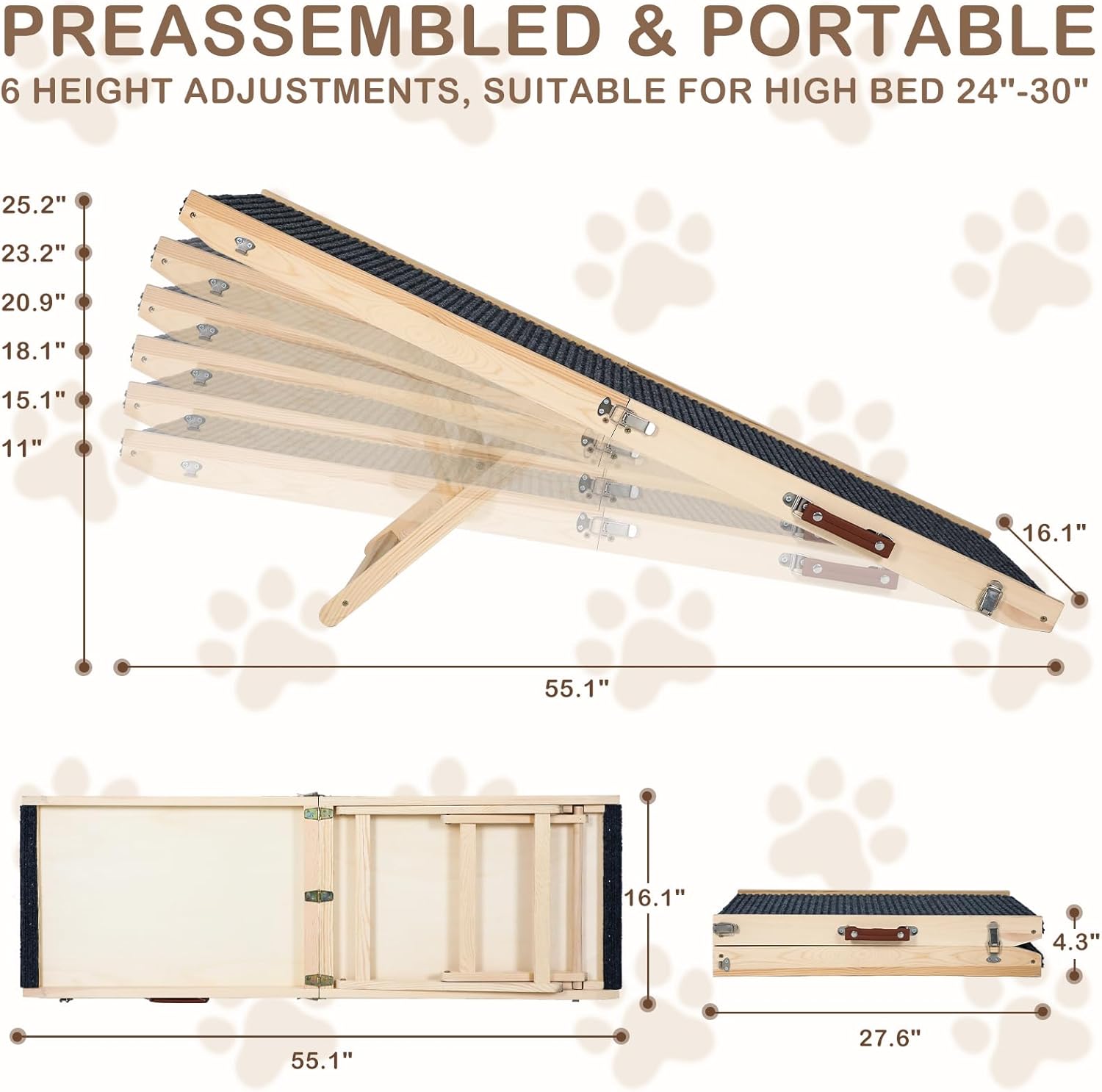 - Adjustable Height for Versatile Use –The dog stair has 6 adjustable heights; Easily customize the ramp heigh from 11.02 to 25.2 inches to fit various heights, perfect for helping your small pets get on and down bed, sofa and car by simply adjusting the ramp height to your needs.
