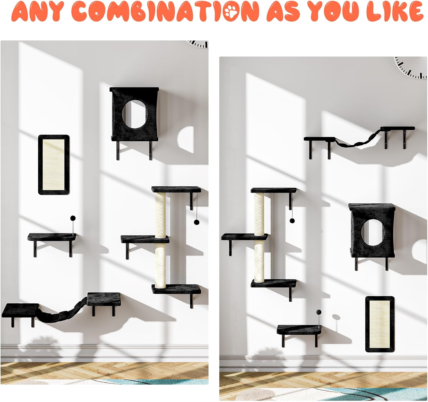 NUNU LAB Wall Mounted Cat Furniture, 5 Pcs Cat Wall Shelves with House, Bridge, Steps, Scratching Post, Shelves, Indoor Safe & Stable Furniture for Kittens Play, Black