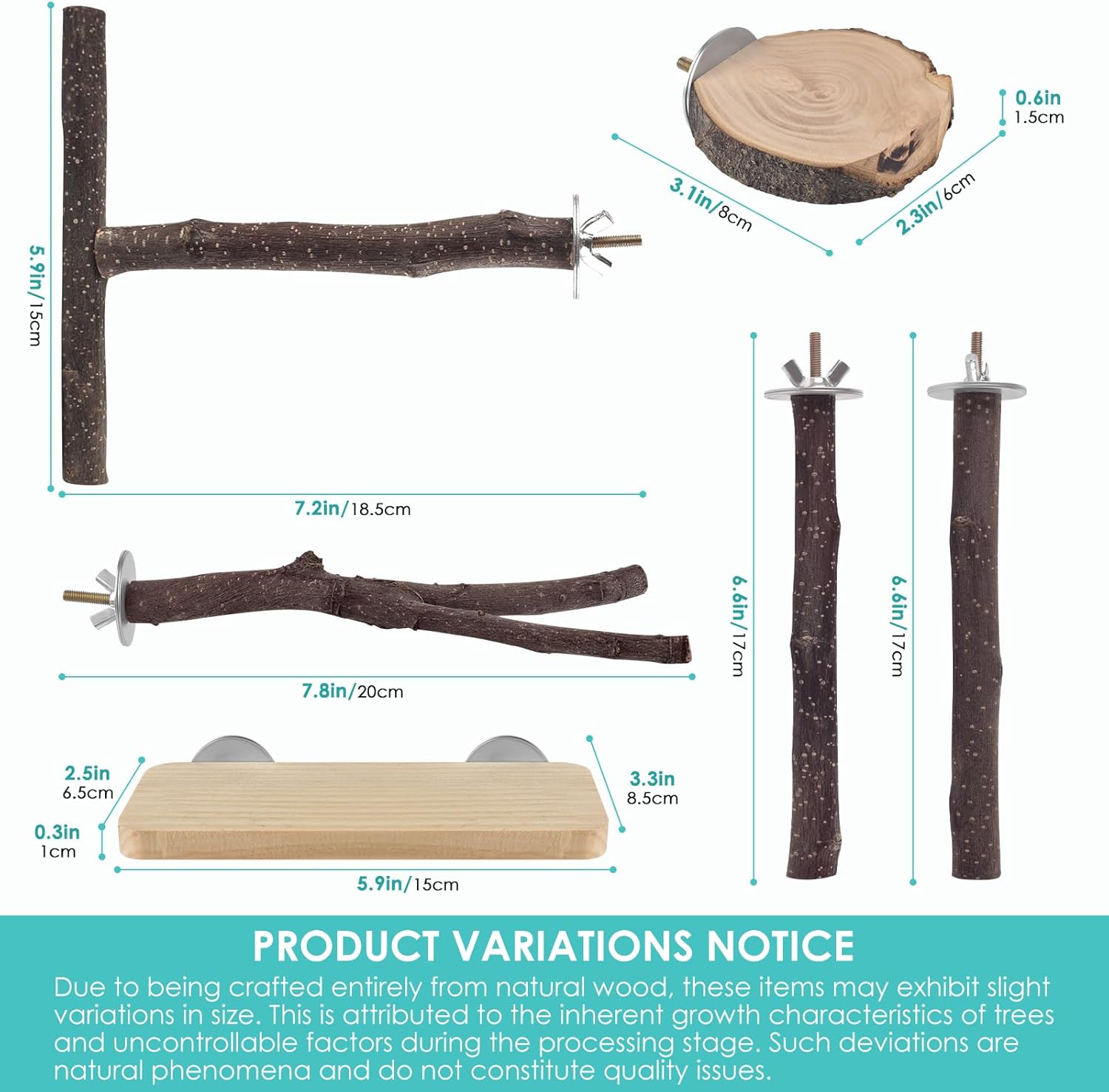 - Bird Cage Accessories: Natural perches for parakeets set includes 1 Combo T-Shaped Bird Perch, 1 Round Parrot Platform, 1 Y-Shaped Perch, 1 Rectangular Perch Platform, and 2 Wooden Perches Stand. Note: Due to the fact that the perches are made of natural apple wood, individual shapes may vary