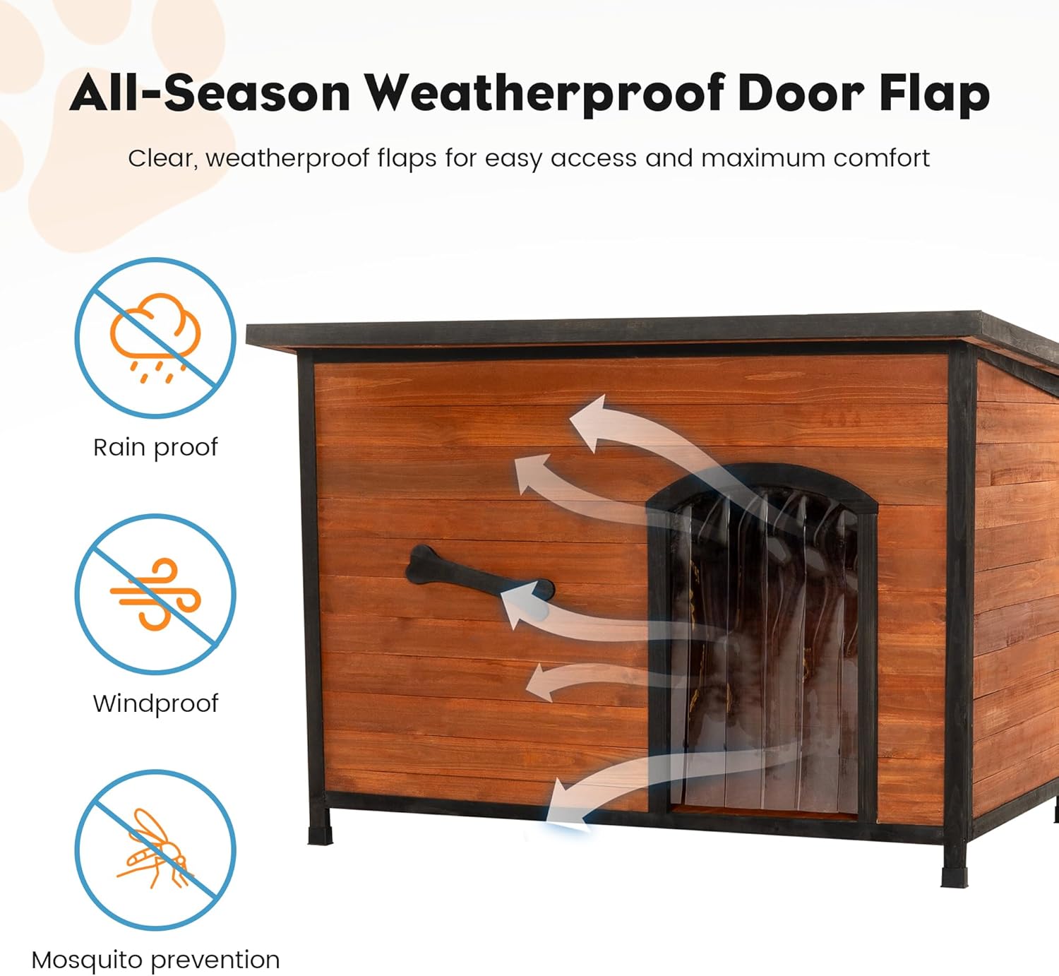 - [Specially Designed for Outdoor Use] The sloping asphalt roof is expertly engineered to prevent rainwater from pooling, ensuring that your pet's living space remains dry and comfortable. The floor is 2.4’’ above the ground, and there is a removable PVC curtain and adaptable floor pads for uneven ground. This design enables the dog house to withstand harsh weather conditions, preventing water from seeping in and materials from getting damp