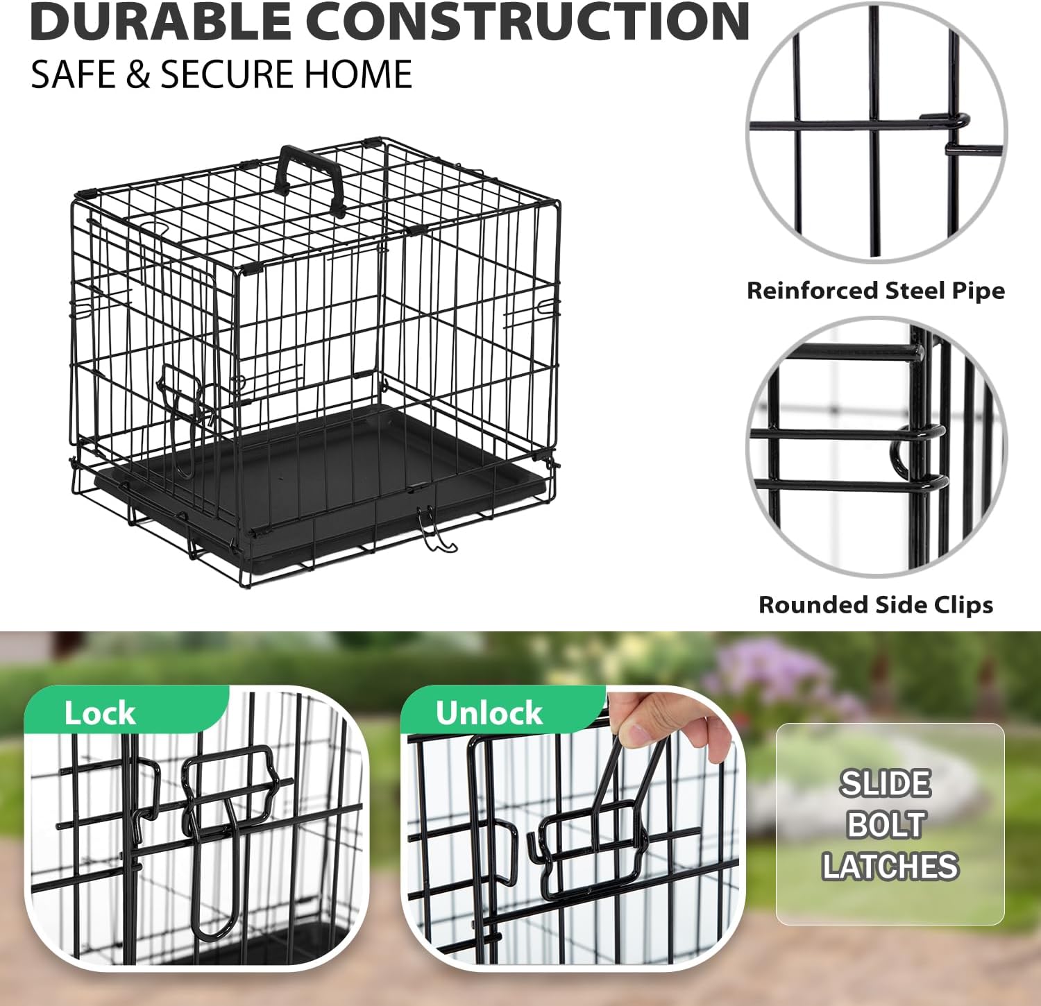 - SAFE & SECURE DOG CAGE: This durable dog cage features reinforced steel pipes, rounded corners, and dual latches on both front & side doors, to keep your pet secure during dog training or quiet time.