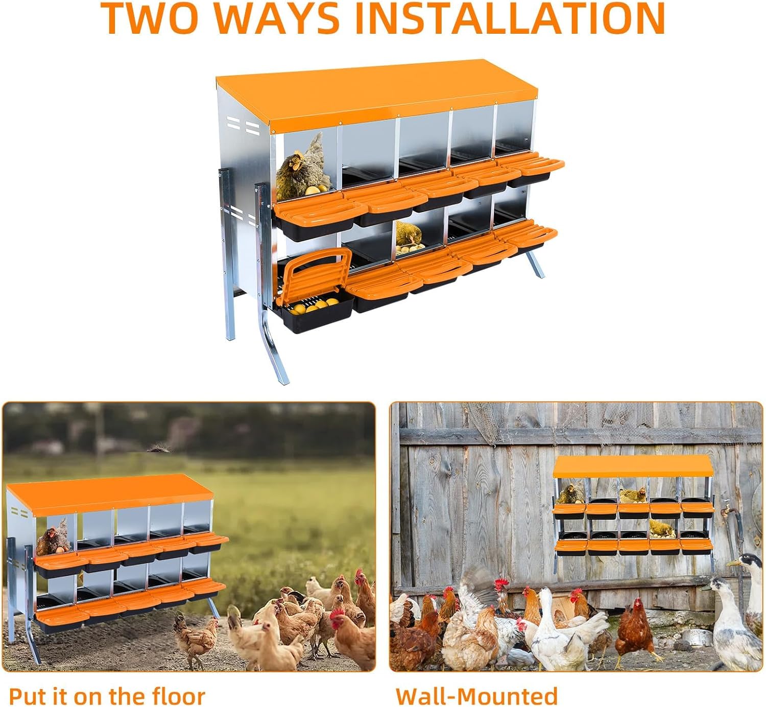 Chicken Nesting Boxes, 10 Hole Metal Chicken Laying Box with with Removable Trays and Roll Out Egg Collection for Chicken Coop, with Metal Bracket, Orange