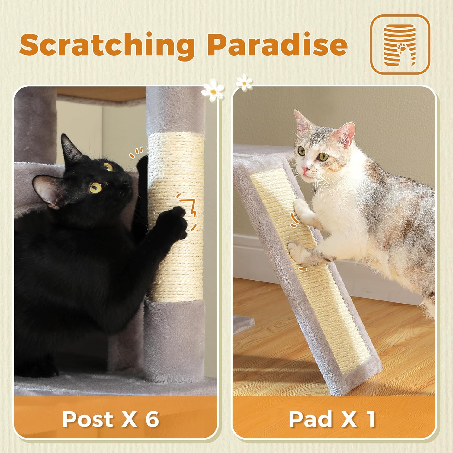 - Ultimate Scratching & Play Center: Designed for large adult cats, this Big cat tree features 6 durable sisal-covered scratching posts, a 2-in-1 scratch pad runway, and 2 dangling toys with 1 bonus replacement ball—perfect for active play and claw care. A cozy round basket hammock and spacious double-door condo offer ideal spots for lounging and napping.