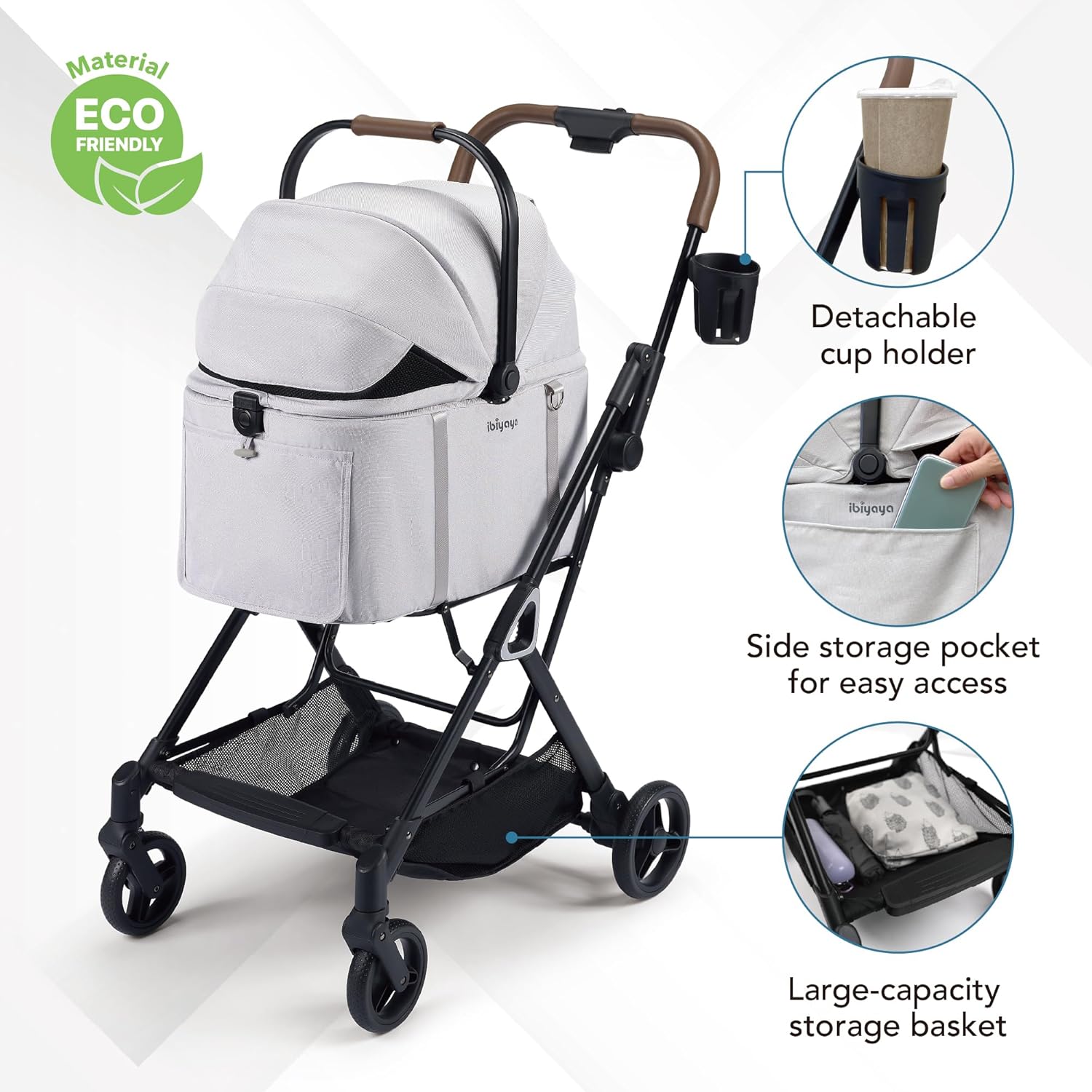 - Need Extra Comfort and Storage? A vegan leather handle adds grip comfort, while the under-basket holds toys, treats, a pet stroller pad, or a pet stroller fan, perfect for longer outings.